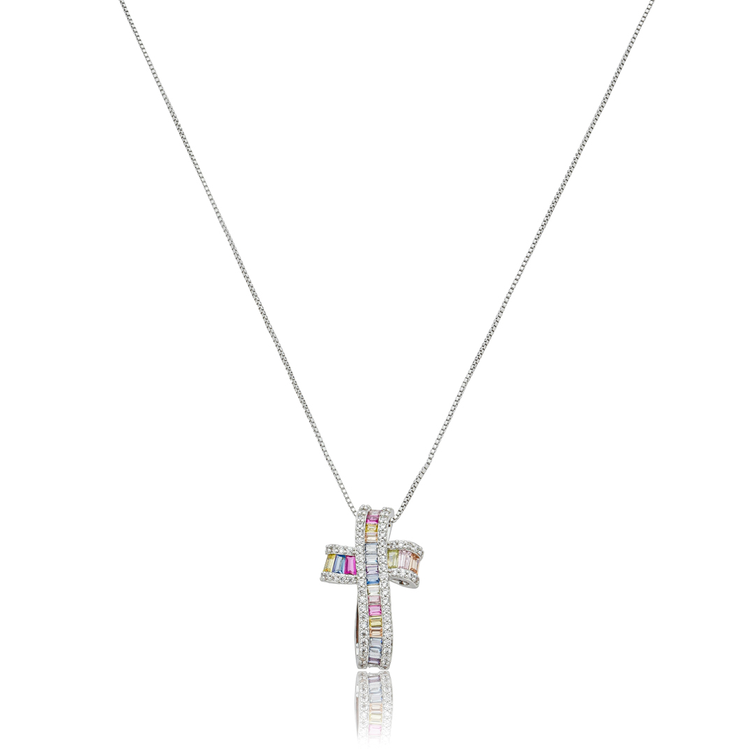 Colar com pingente de curz cravejado de zircônia rainbow banho em ródio branco