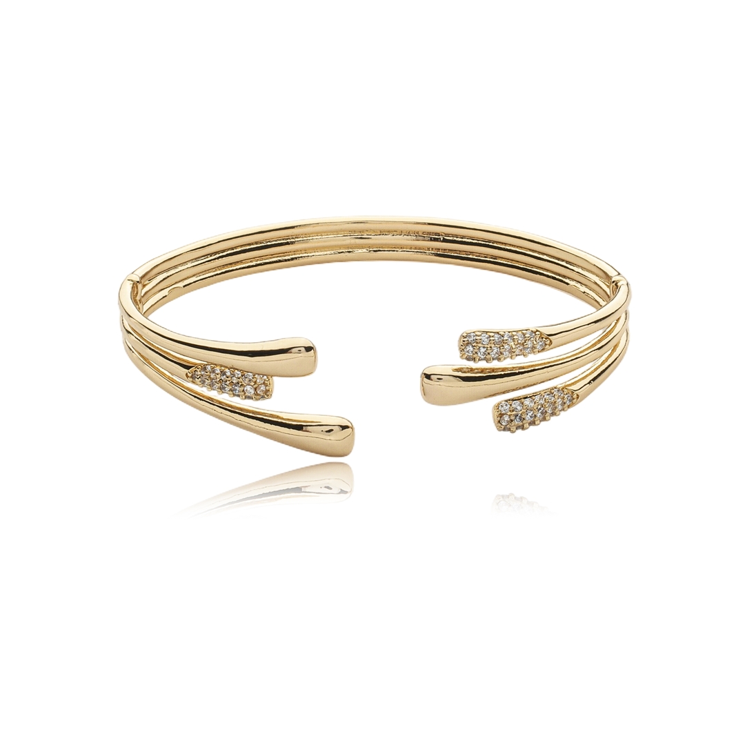 Delicadeza e sofisticação definem este bracelete exclusivo. Banhado a ouro 18k, revela um brilho luxuoso e acabamento de alta qualidade, garantindo durabilidade e resistência ao desgaste. As zircônias cuidadosamente aplicadas trazem um toque de brilho sutil, elevando a elegância do design. Um bracelete atemporal, perfeito para compor looks refinados com leveza e estilo.