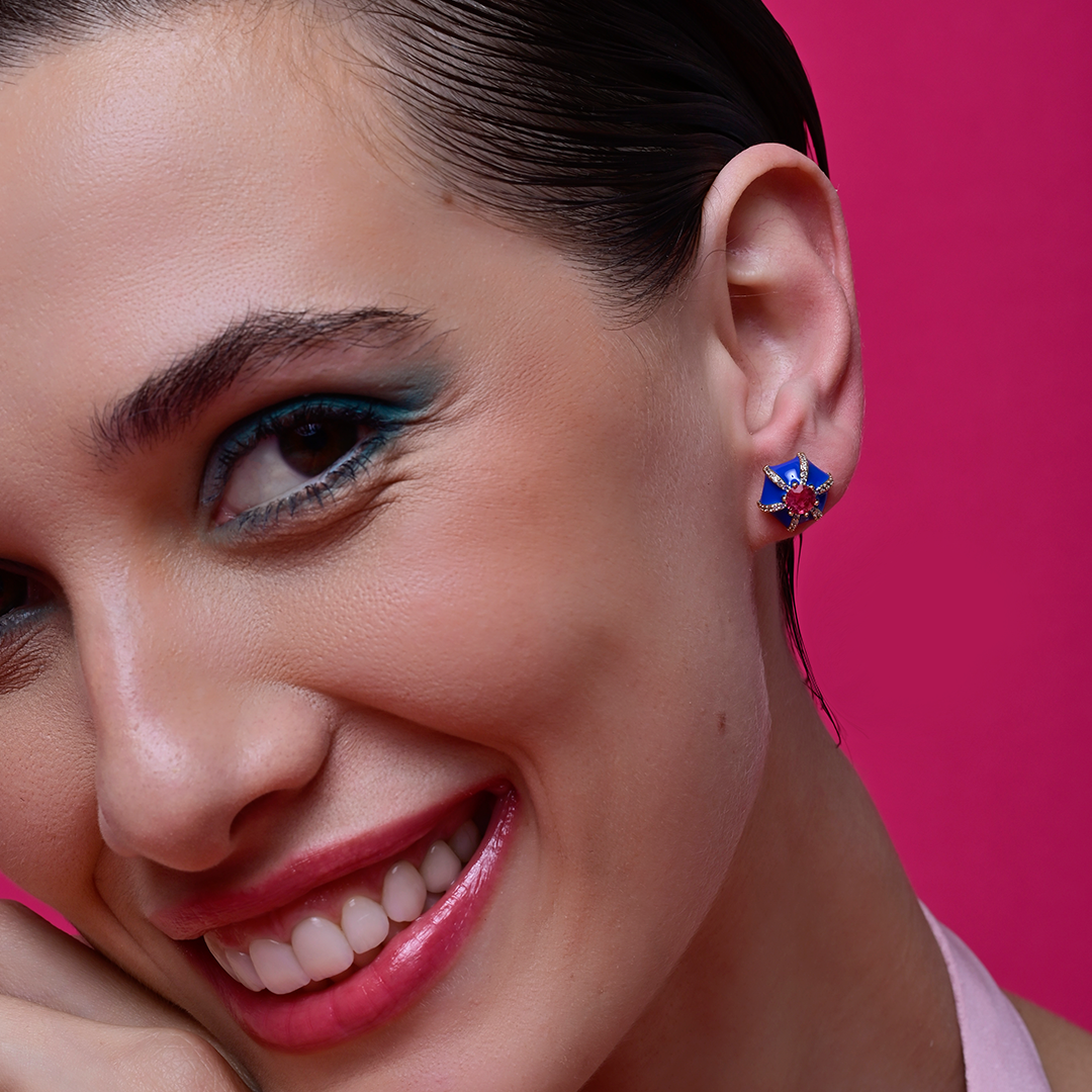 Brinco esmaltado azul com zirconia na cor rubi banho em Ouro 18K