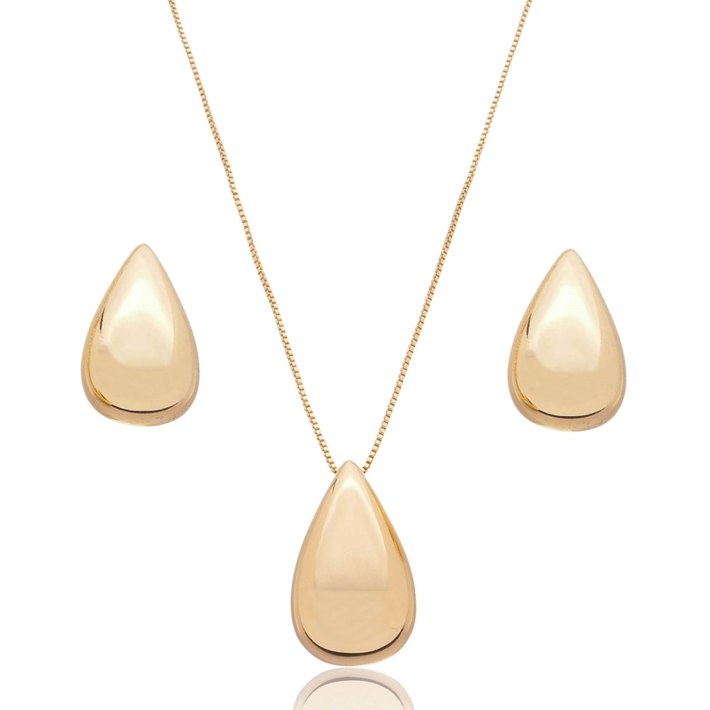Conjunto de brinco e colar de gota dourado liso