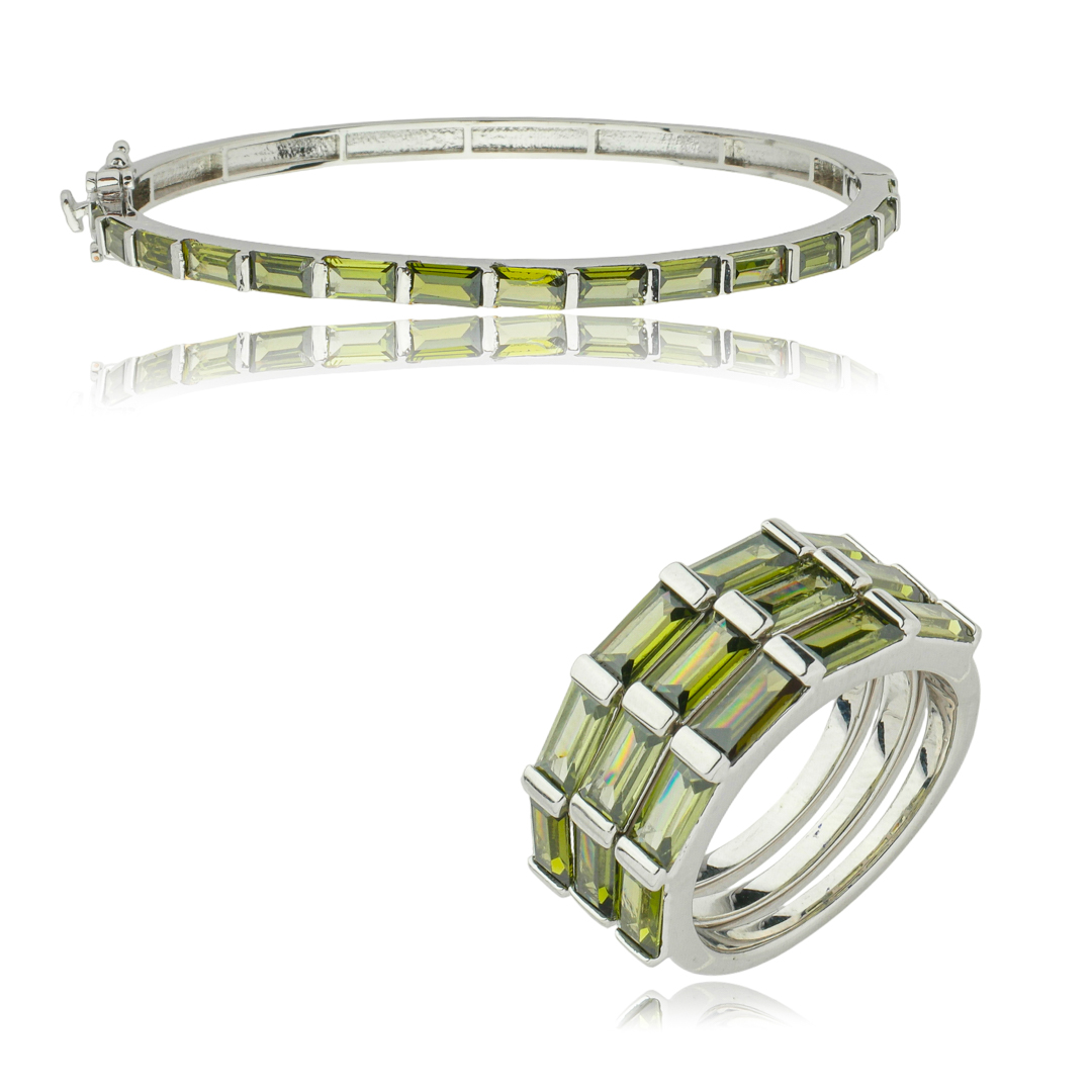 Conjunto de anel e bracelete cravejado de zirconia oliva banho em rodio branco