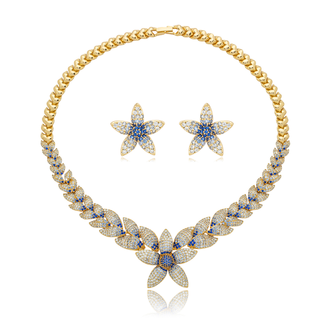 Conjunto de brinco e colar cravejado de zircônia cristal e safira