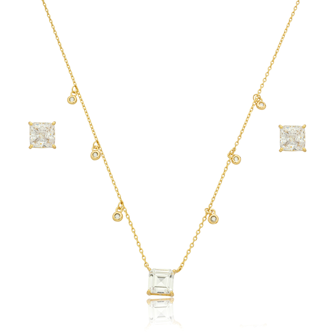 Esse é um conjunto elegante e sofisticado de brinco e colar de semijoias de pedra com zircônia no banho em ouro 18k. Complemente seu visual com essa peça de alta qualidade e brilho intenso. Ideal para ocasiões especiais ou para uso diário. Feito com materiais de primeira linha, esse conjunto é resistente e durável, além de possuir um design moderno e elegante. As pedras de zircônia imitam com perfeição o brilho dos diamantes, proporcionando um visual luxuoso e glamoroso.