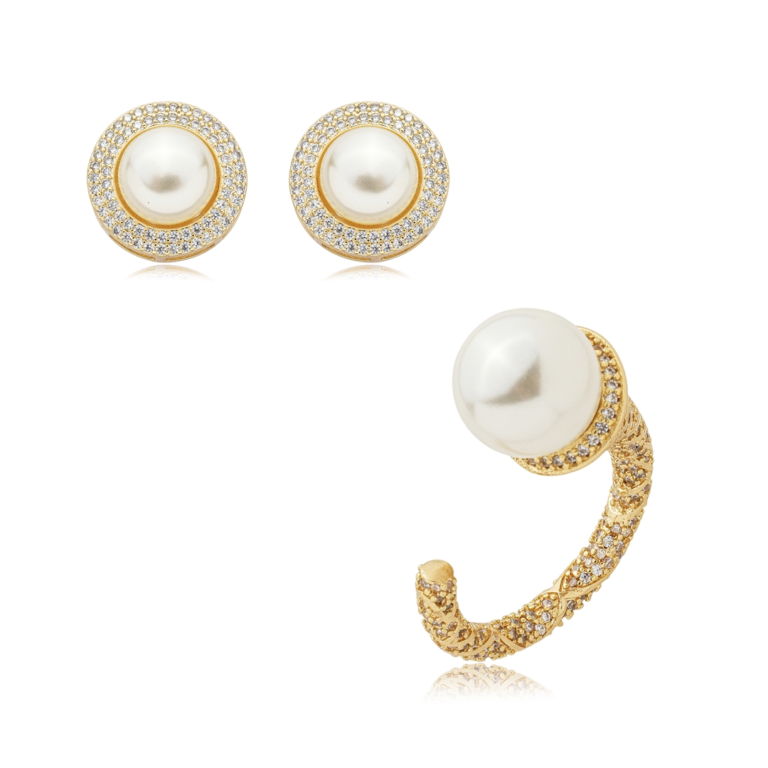 Conjunto de brinco e anel de pérola cravejado de zirconia cristal banho em ouro 18k