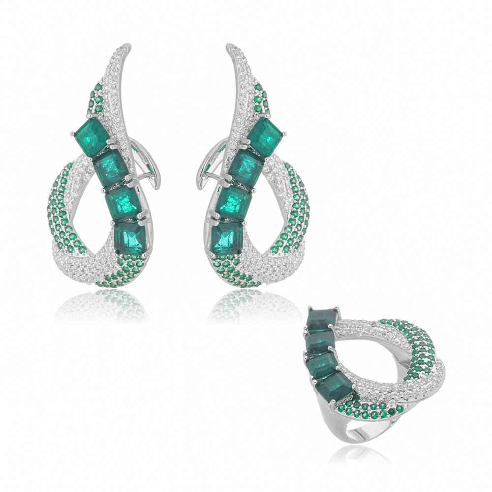 Conjunto luxo de brinco e anel cravejado de zirconia cristal com detalhe em verde esmeralda