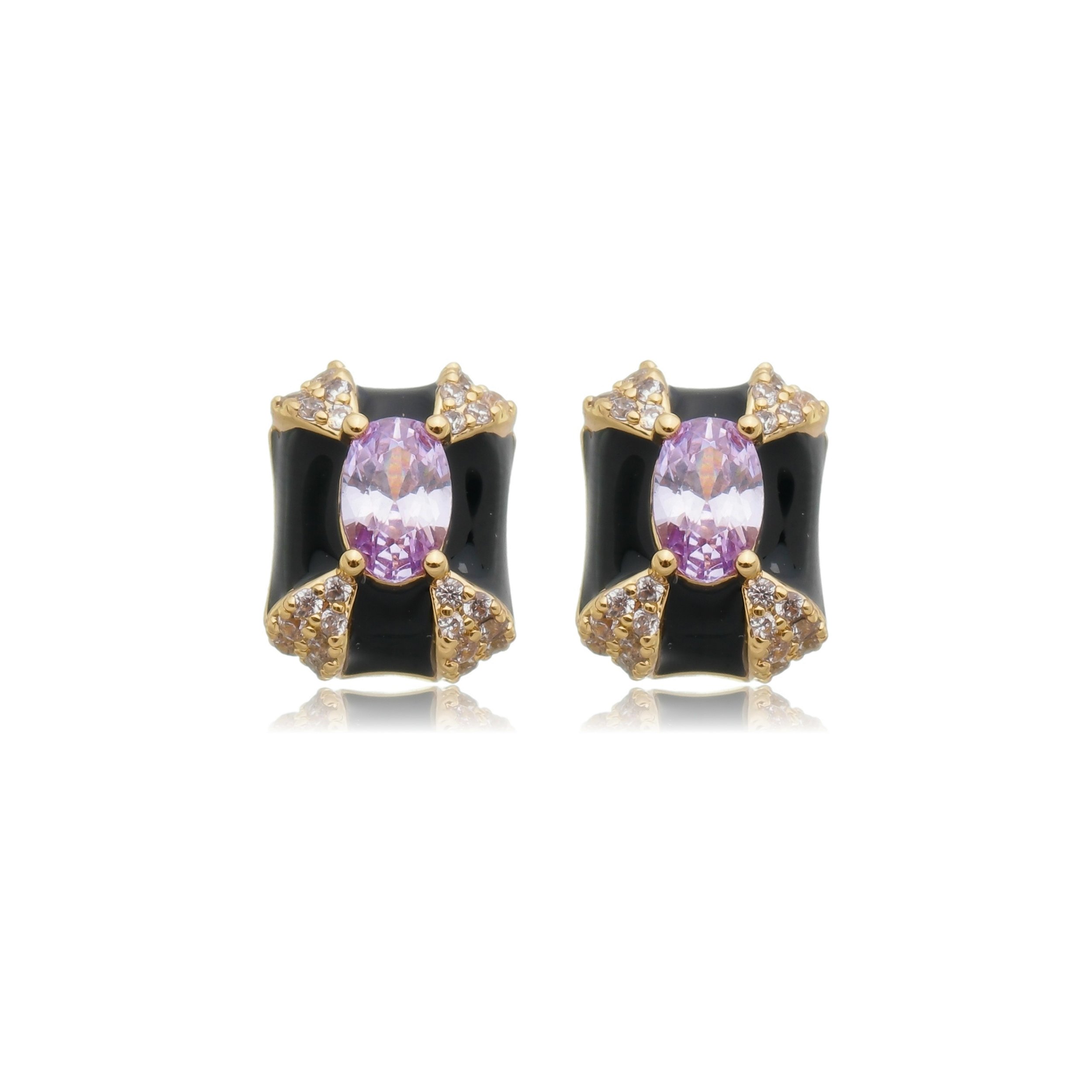 Brinco esmaltado preto com zirconia na cor ametista banho em Ouro 18K