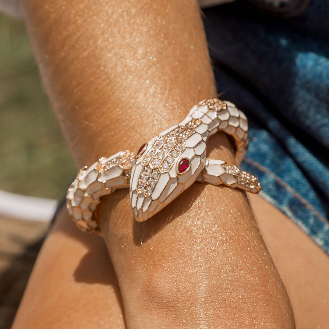 Bracelete esmaltado branco luxo de serpente cravejado de zirconia