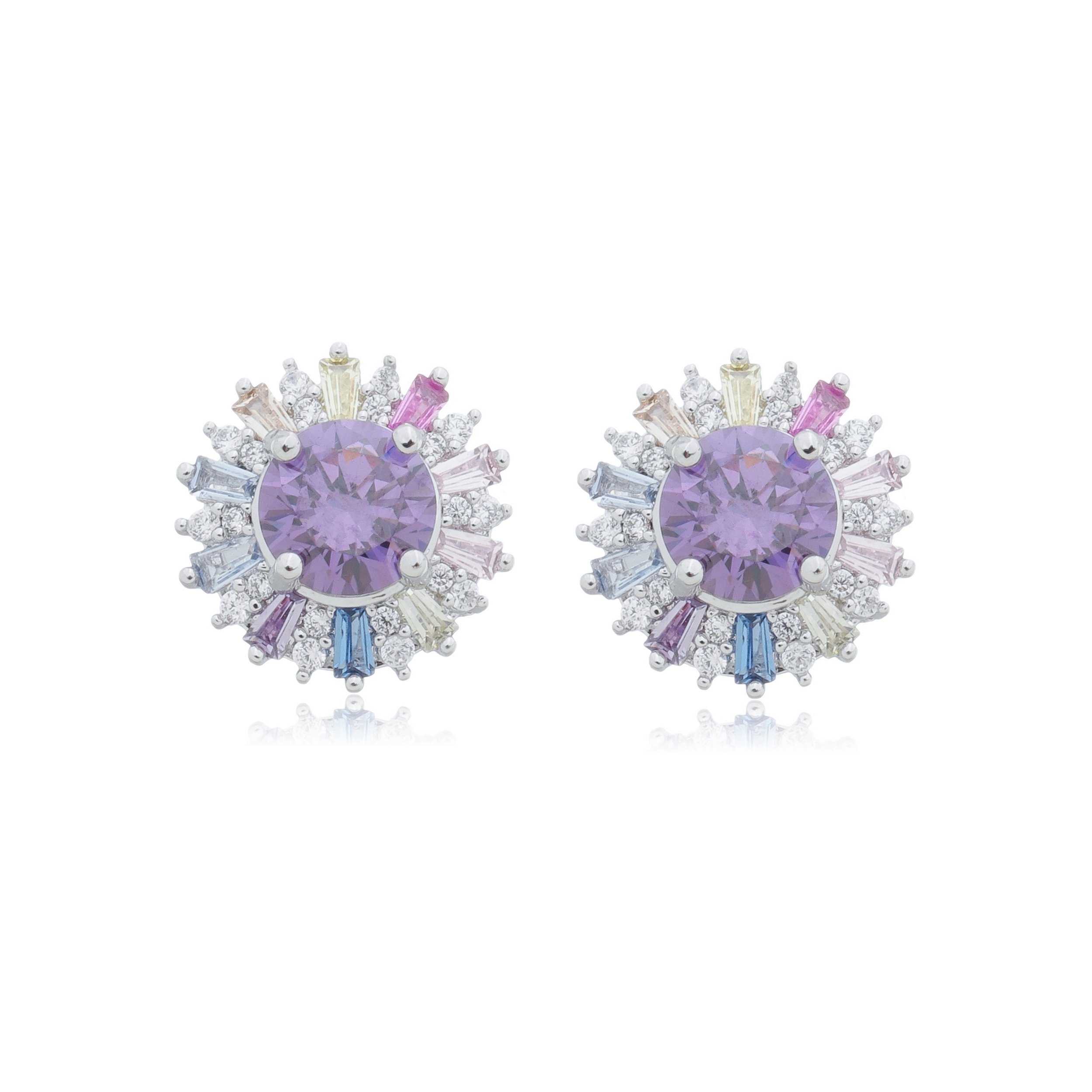 Brinco de base cravejado de zirconia colorida com detalhe em pedra ametista