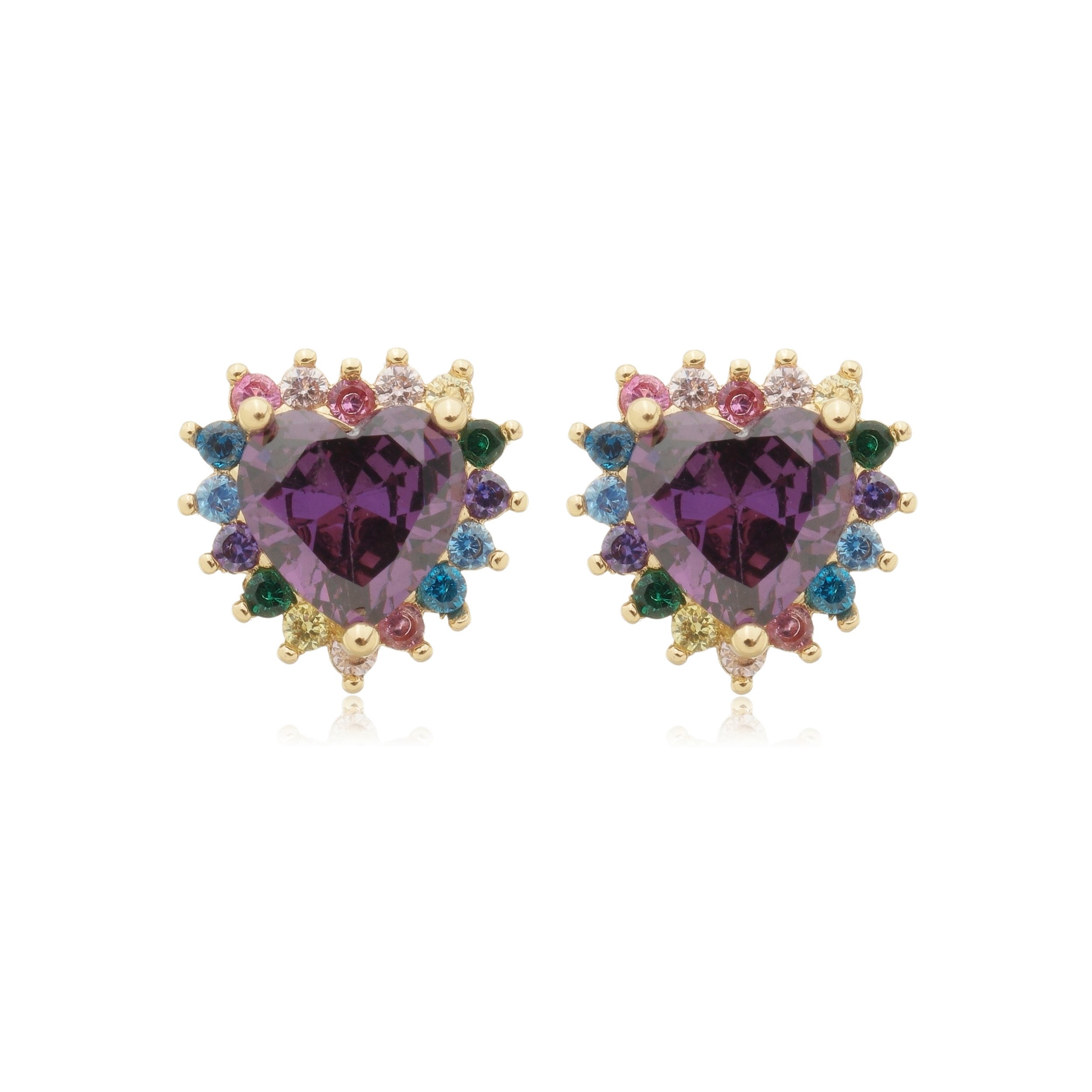 Brinco de base cravejado de zirconia colorida com detalhe em pedra ametista