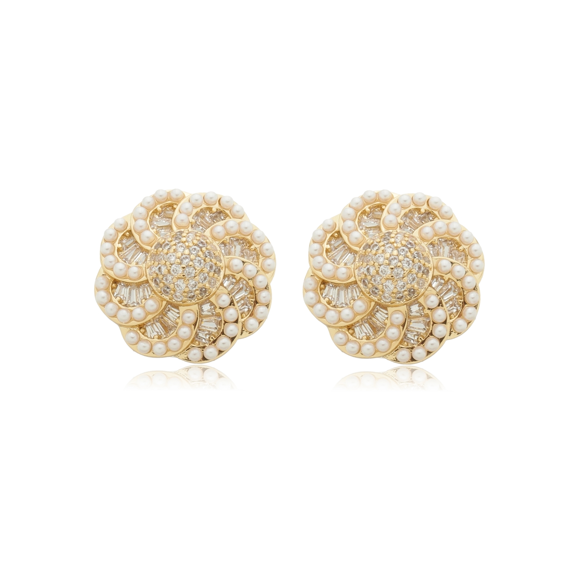 Brinco de base de flor cravejado de zirconia cristal com detalhe em micro pérola
