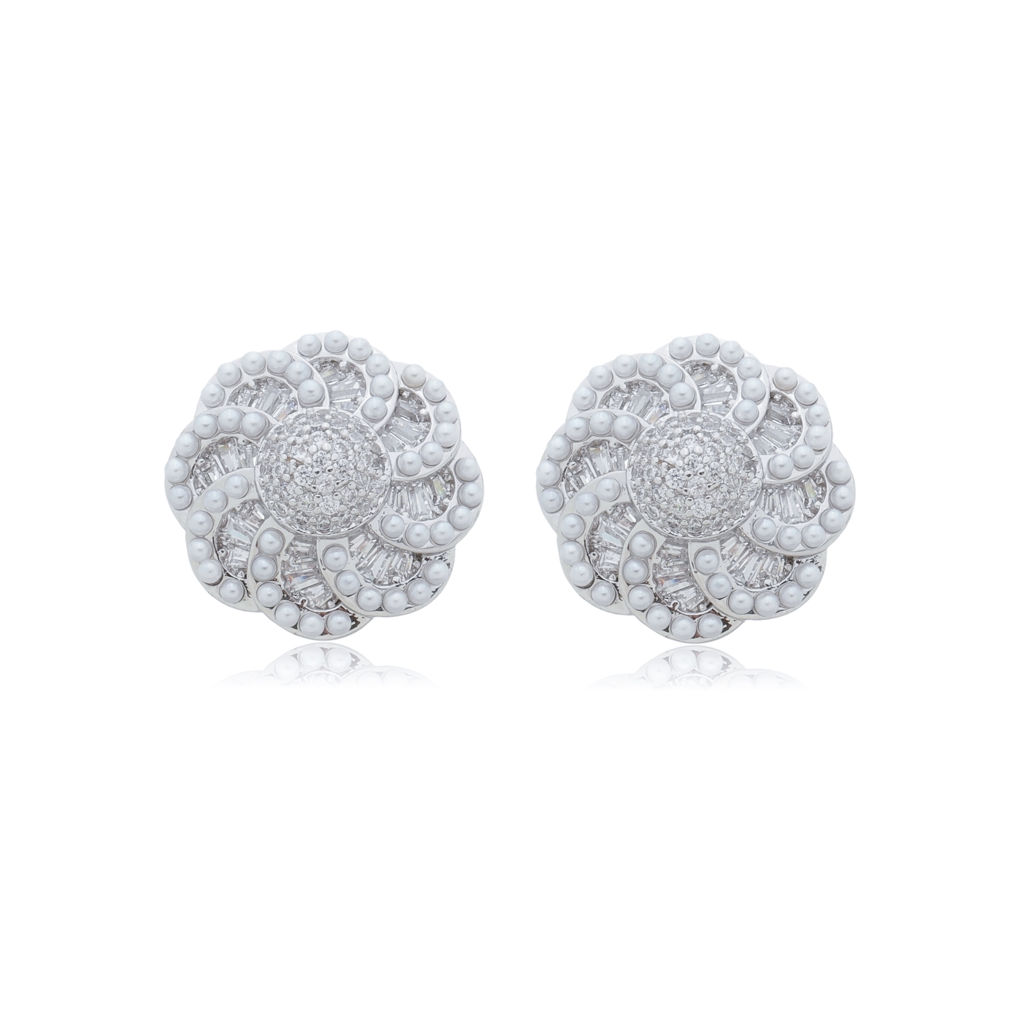 Brinco de base de flor cravejado de zirconia cristal com detalhe em micro pérola