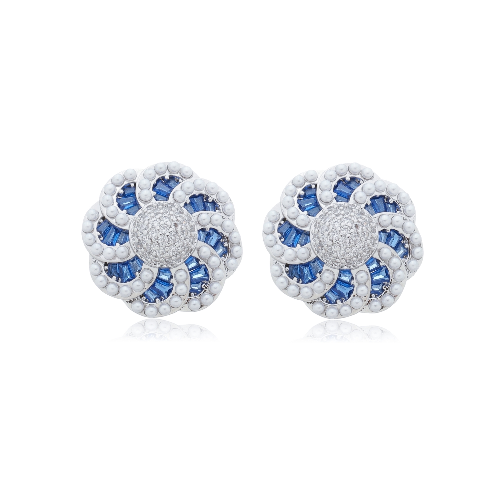 Brinco de base de flor cravejado de zirconia zafira com detalhe em micro pérola