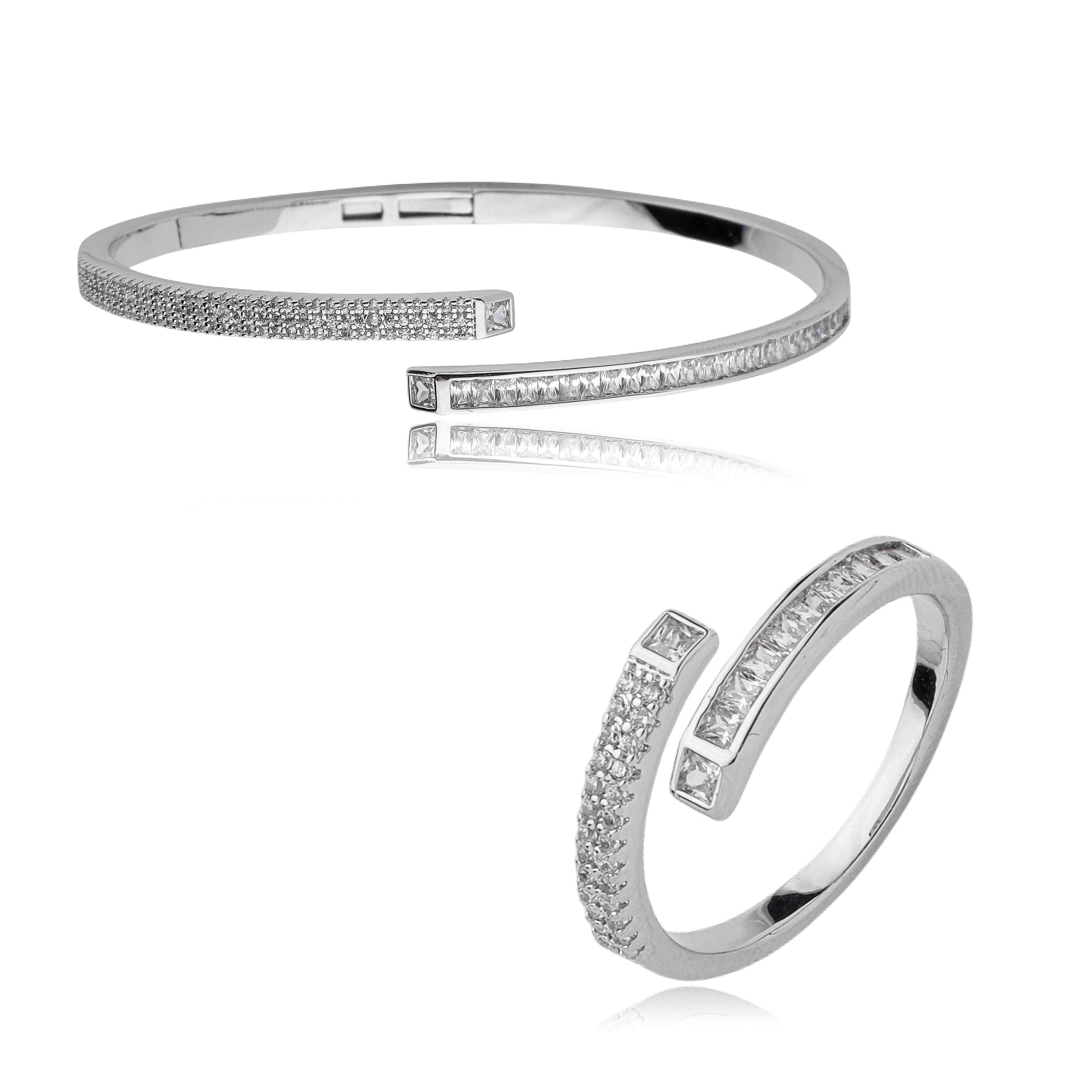 Conjunto de anel e bracelete cravejado de zirconia cristal banho em rodio branco