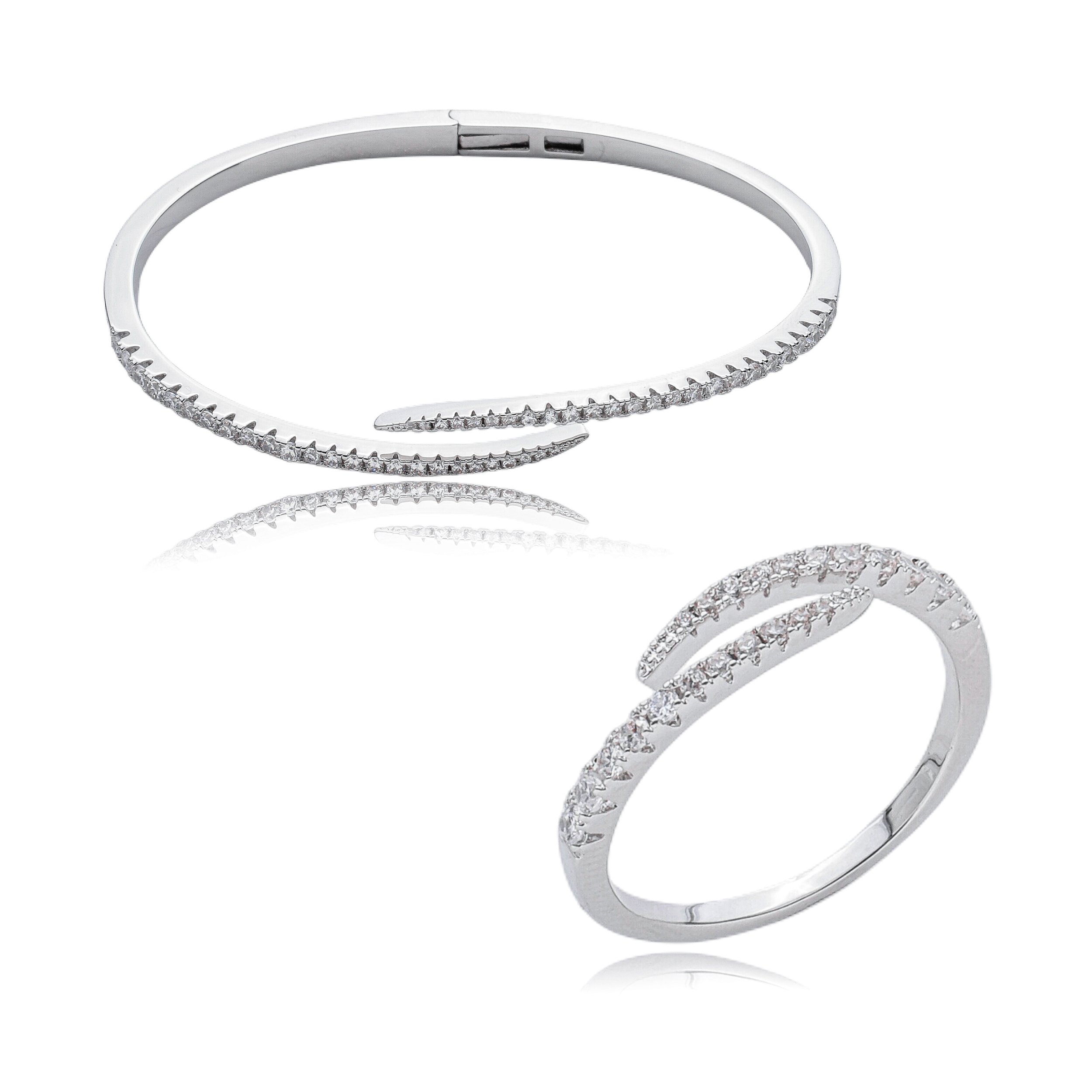 Conjunto de anel e bracelete cravejado de zirconia cristal banho em rodio branco