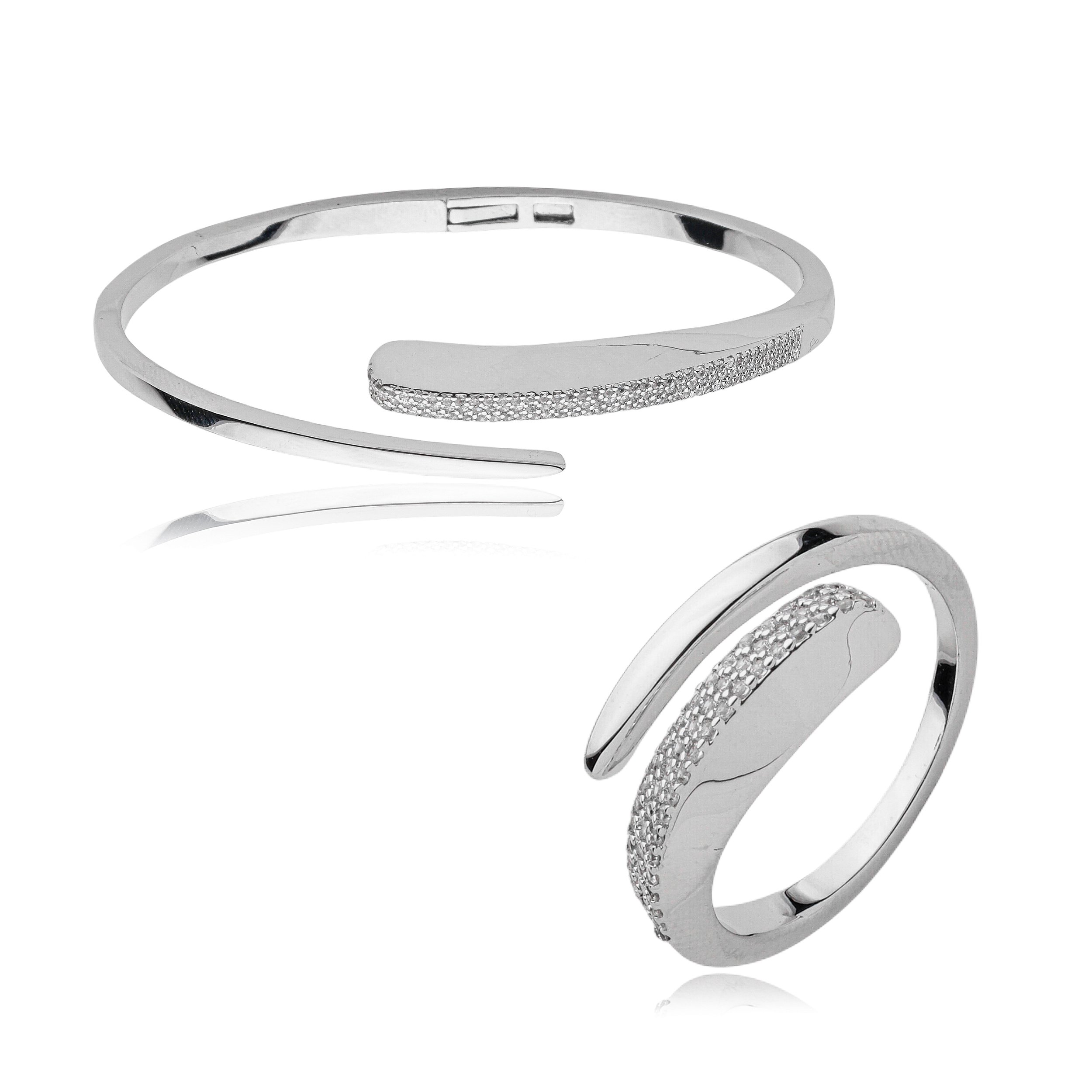 Conjunto de anel e bracelete cravejado de zirconia cristal banho em rodio branco