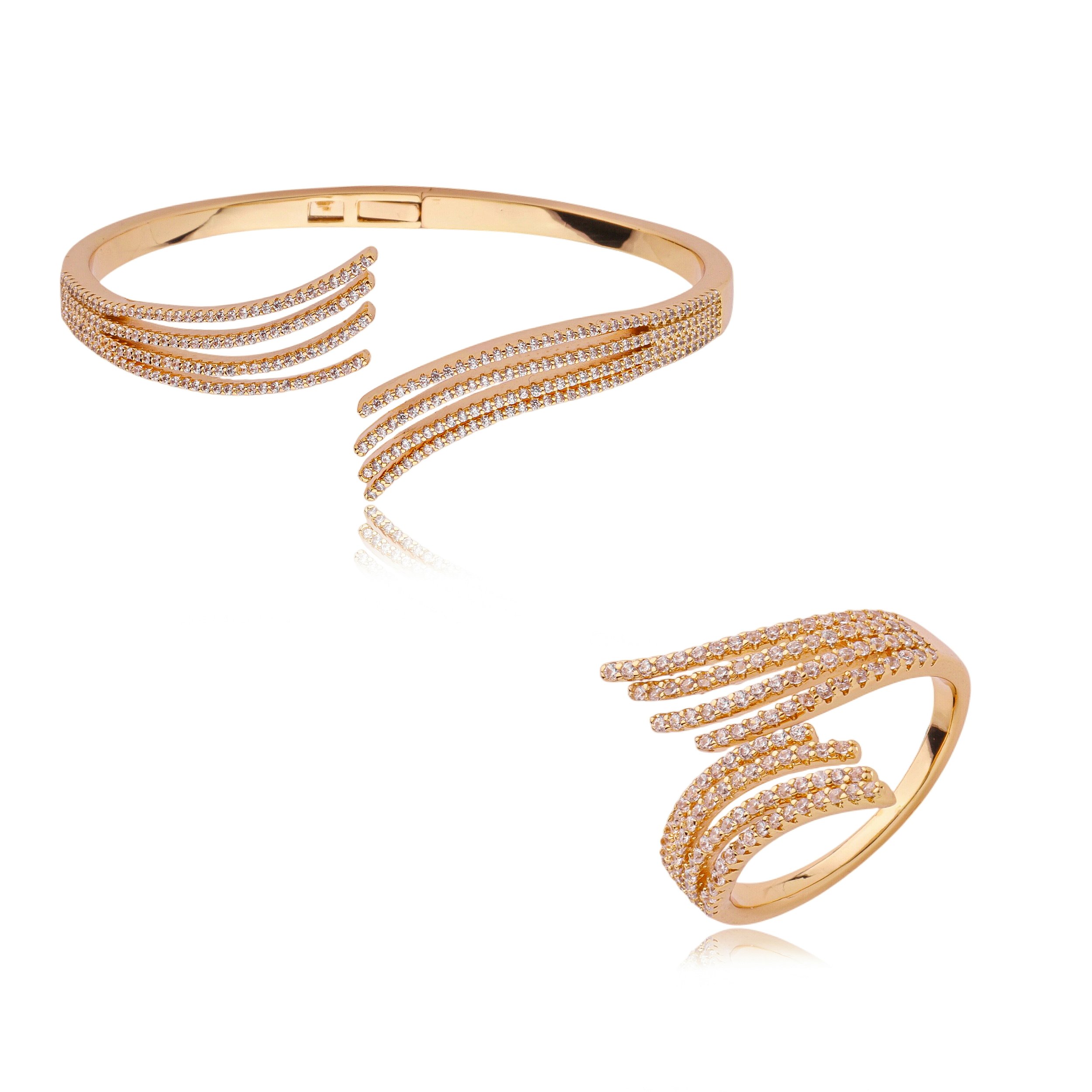 Conjunto de anel e pulseira cravejado de zirconia cristal banho em ouro 18k