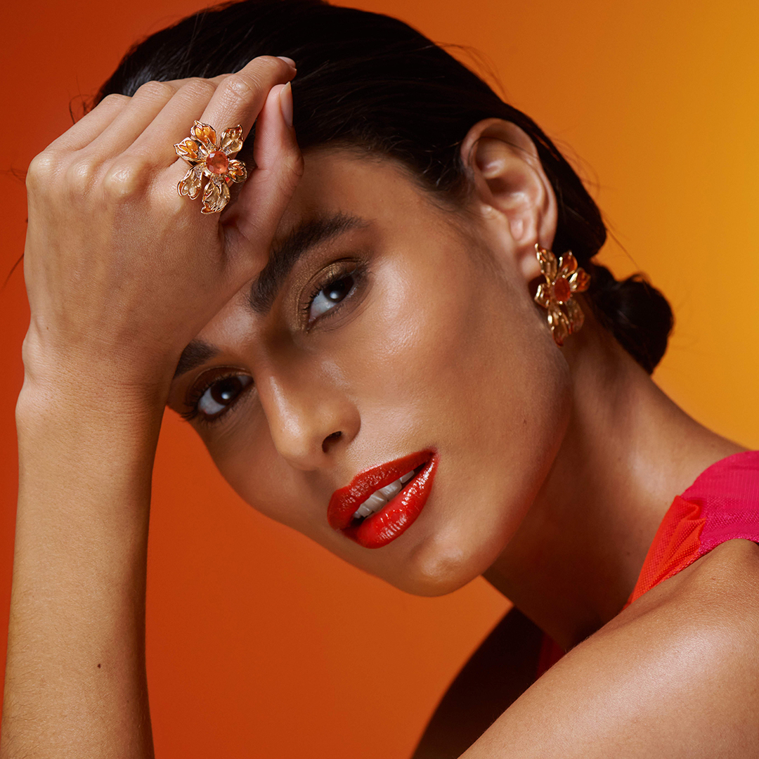 Conjunto de brinco e anel esmaltado laranja dourado com detalhe em zirconia