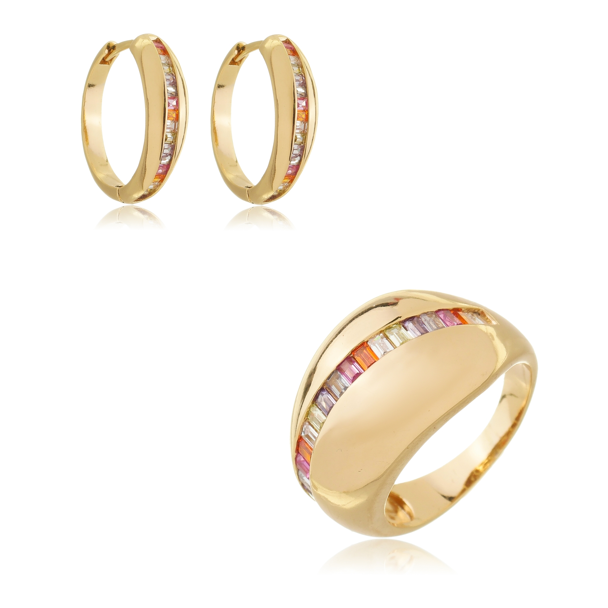 Conjunto de brinco e anel cravejado de zirconia rainbow banho em ouro 18k