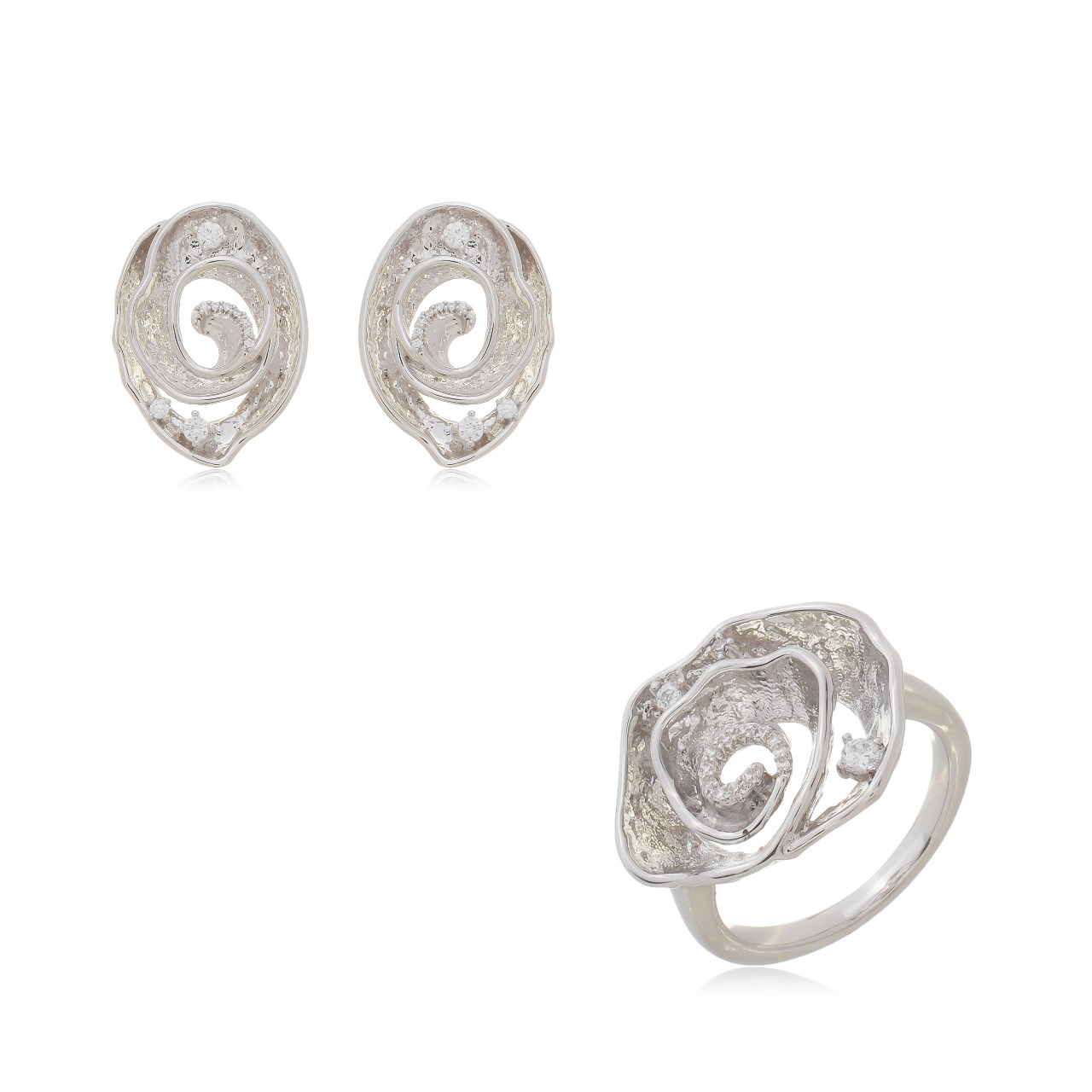 Conjunto de brinco e anel com detalhe de zirconia cristal banho em ródio branco.