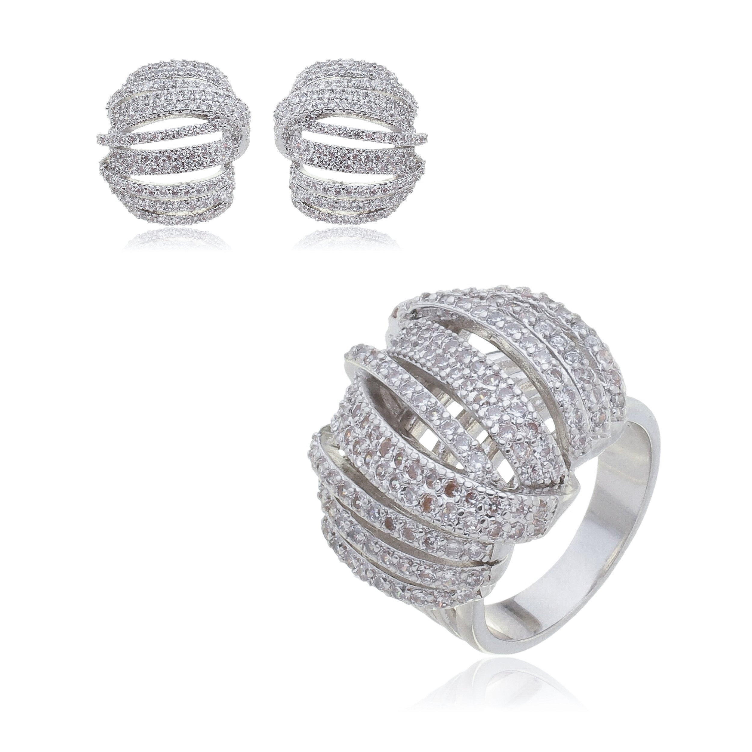 Conjunto de brinco e anel com zirconia cristal banho em rodio branco