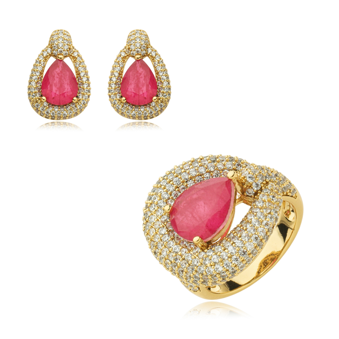 Conjunto de brinco e anel cravejado de zirconia e pedra fusion banho em ouro 18k