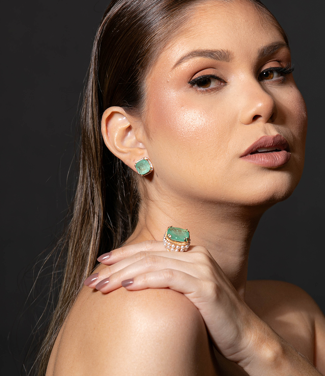 Conjunto de brinco e anel cravejado de zirconia e pedra fusion banho em ouro 18k
