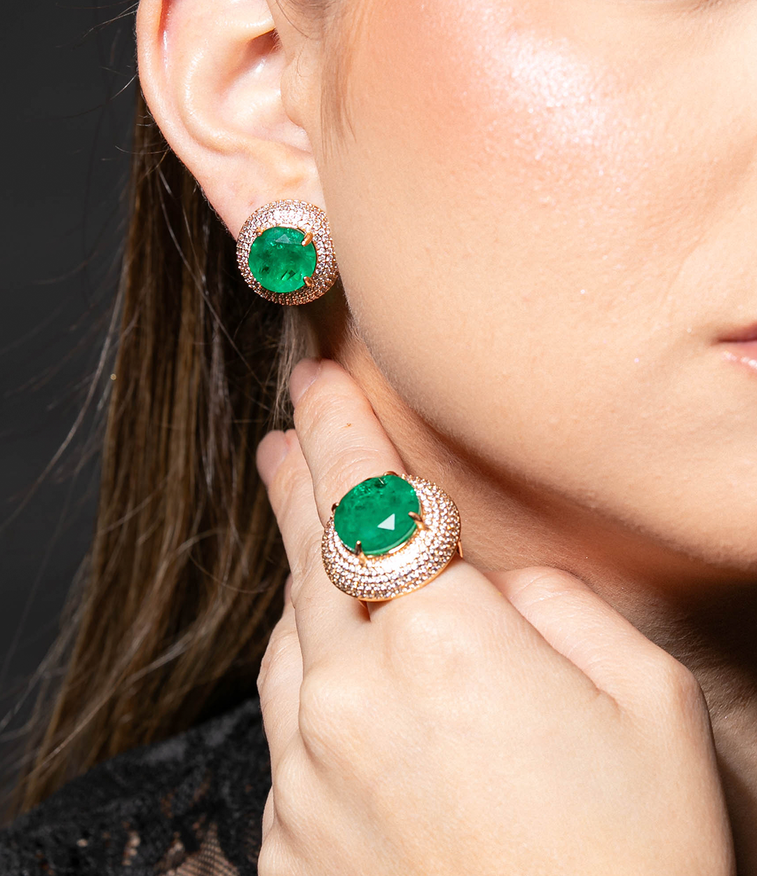 Conjunto de brinco e anel cravejado de zirconia e pedra fusion banho em ouro 18k
