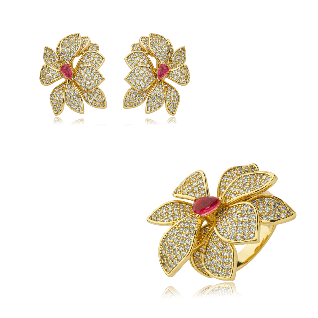 Conjunto de brinco e anel cravejado de zirconia pink e cristal banho em ouro 18k