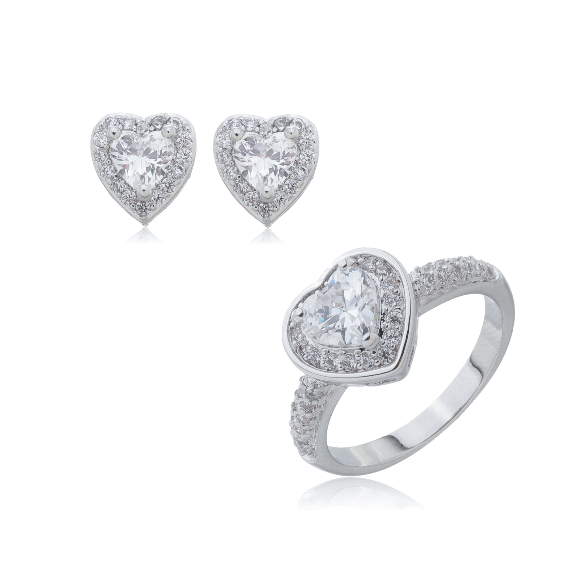 Conjunto de brinco e anel de coração com zirconia cristal banho em rodio branco