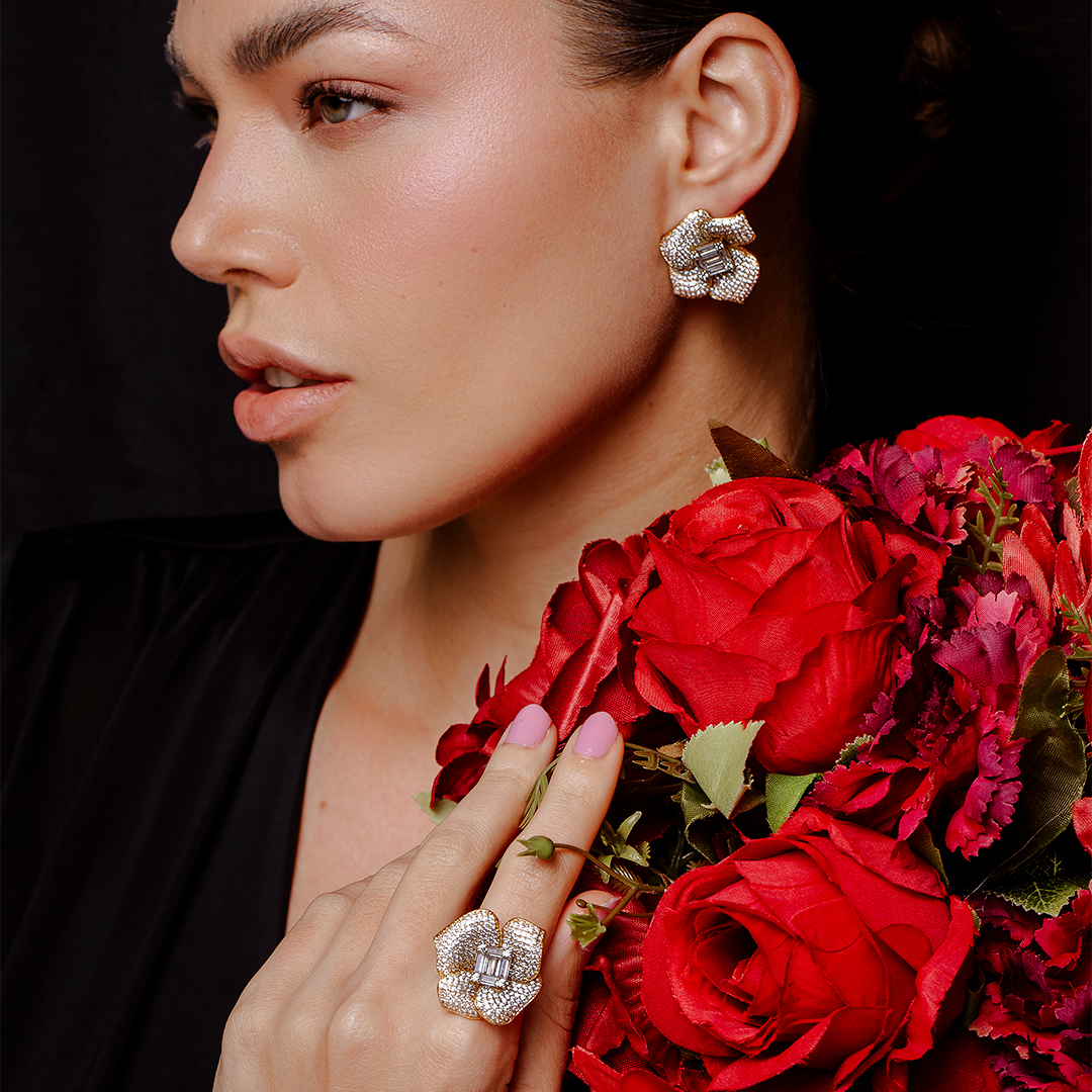 Conjunto de brinco e anel cravejado de zirconia cristal