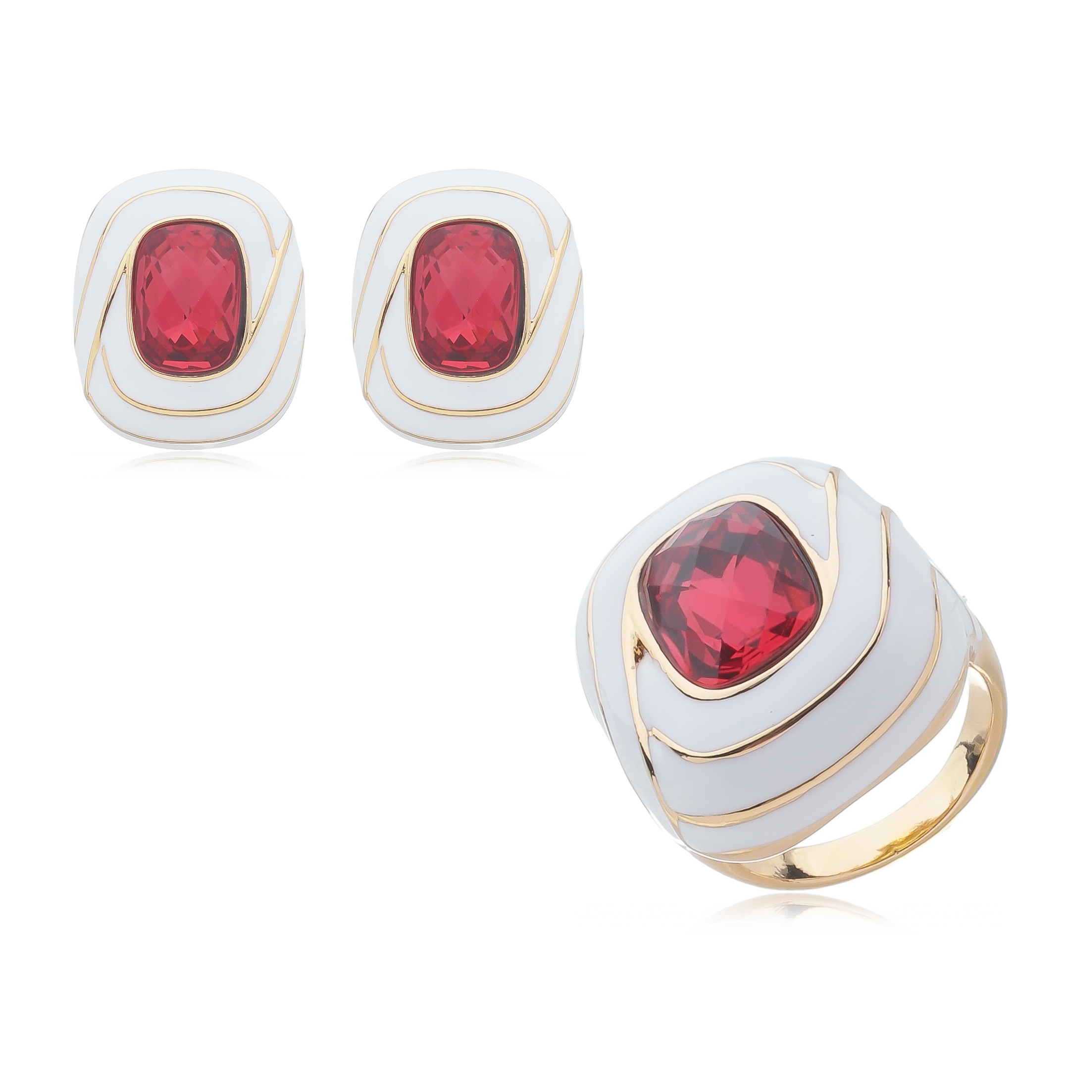 Conjunto de brinco e anel esmaltado branco com zirconia banho em ouro 18K