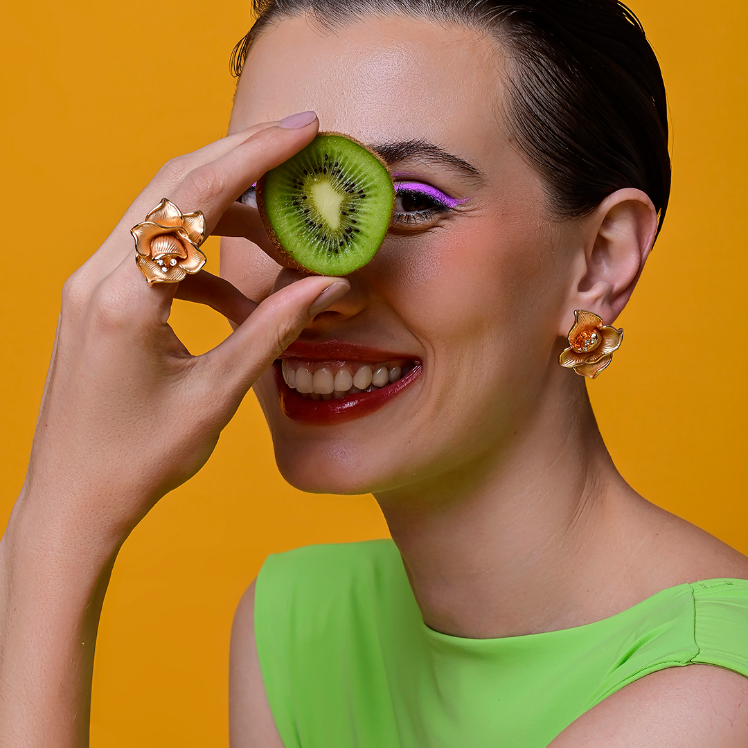 Conjunto de brinco e anel flor acetinado banho em ouro 18K