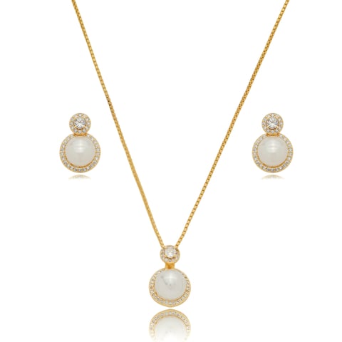 Conjunto de brinco e colar de perola com zirconia cristal banho em ouro 18k