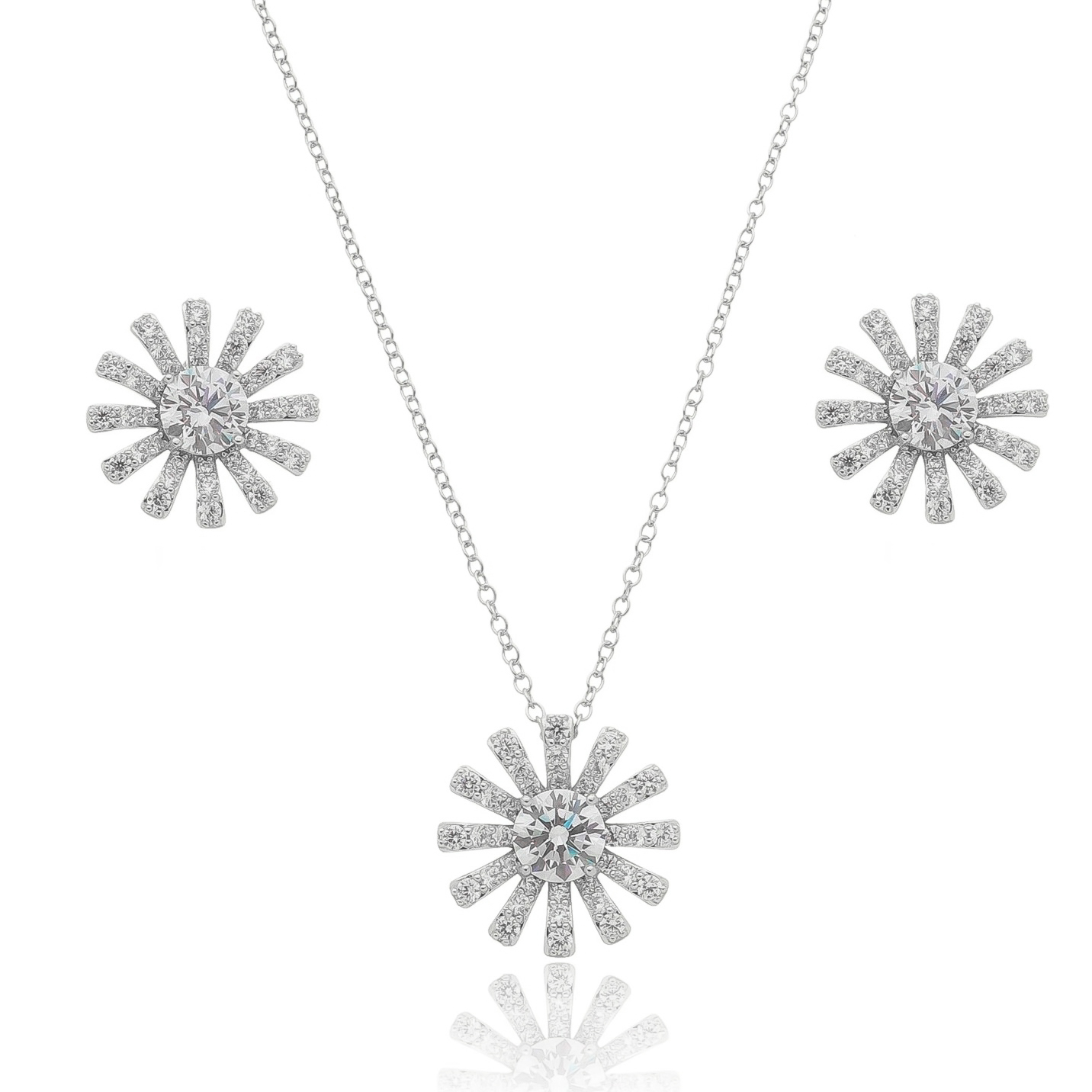 Conjunto de brinco e colar de flor cravejado de zirconia cristal