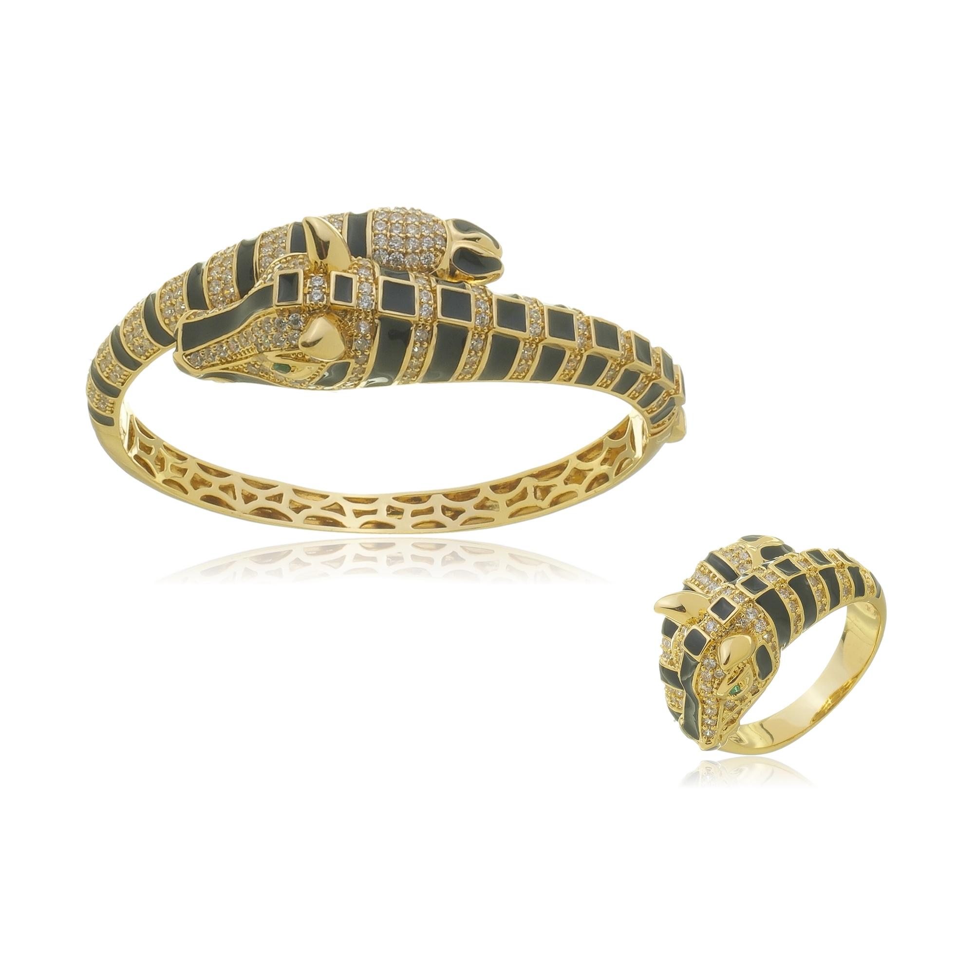 Conjunto de pulseira e anél esmaltado cravejado de zircônia cristal com detalhe em zircônia esmeralda