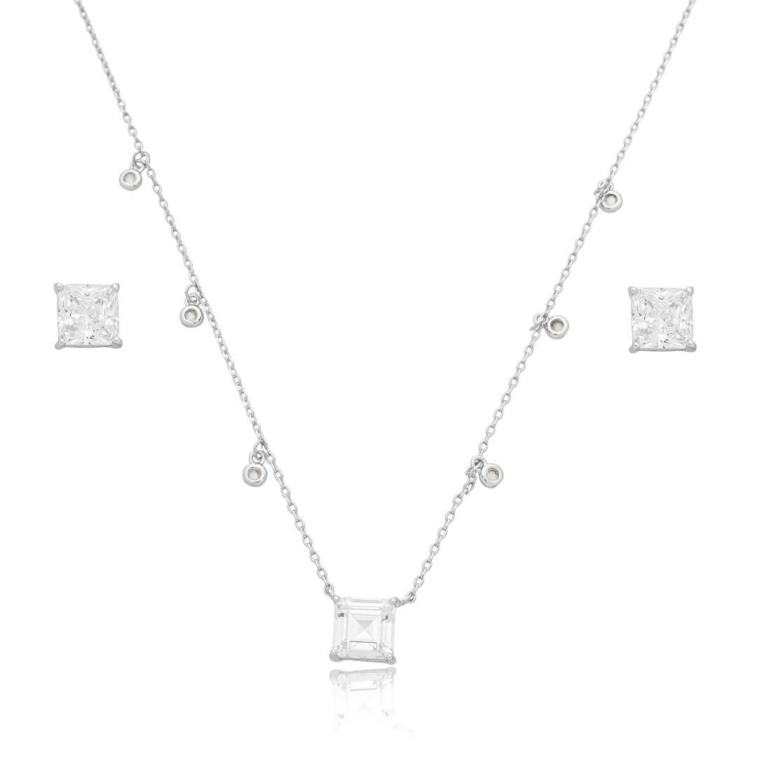 Esse é um conjunto elegante e sofisticado de brinco e colar de semijoias de pedra com zircônia no banho em ródio branco. Complemente seu visual com essa peça de alta qualidade e brilho intenso. Ideal para ocasiões especiais ou para uso diário. Feito com materiais de primeira linha, esse conjunto é resistente e durável, além de possuir um design moderno e elegante. As pedras de zircônia imitam com perfeição o brilho dos diamantes, proporcionando um visual luxuoso e glamoroso.
