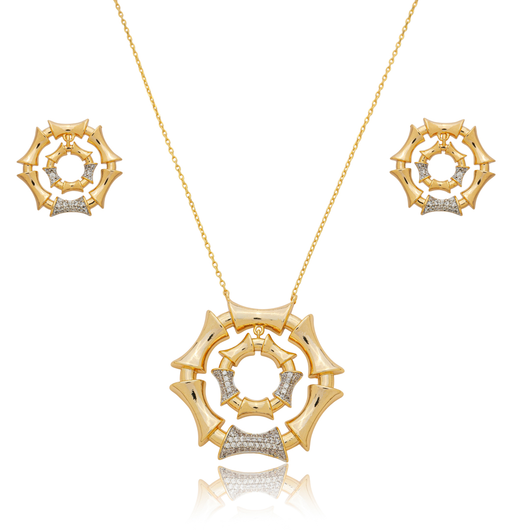 Esse é um conjunto elegante e sofisticado de brinco e colar de semijoias de pedra com zircônia no banho em ouro 18k. Complemente seu visual com essa peça de alta qualidade e brilho intenso. Ideal para ocasiões especiais ou para uso diário. Feito com materiais de primeira linha, esse conjunto é resistente e durável, além de possuir um design moderno e elegante. As pedras de zircônia imitam com perfeição o brilho dos diamantes, proporcionando um visual luxuoso e glamoroso.