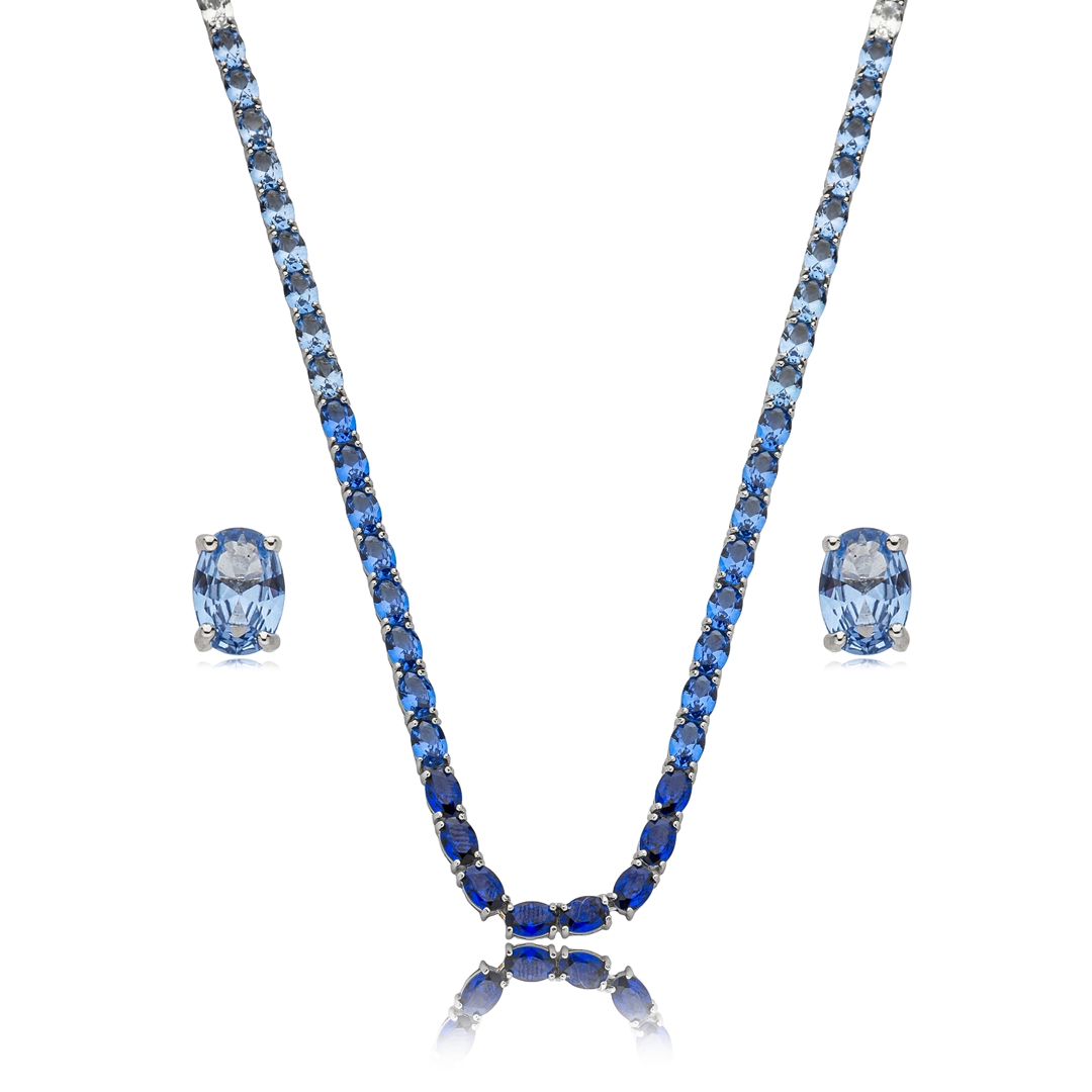 Conjunto riviera de brinco e colar cravejado em degradê de zircônia safira e cristal