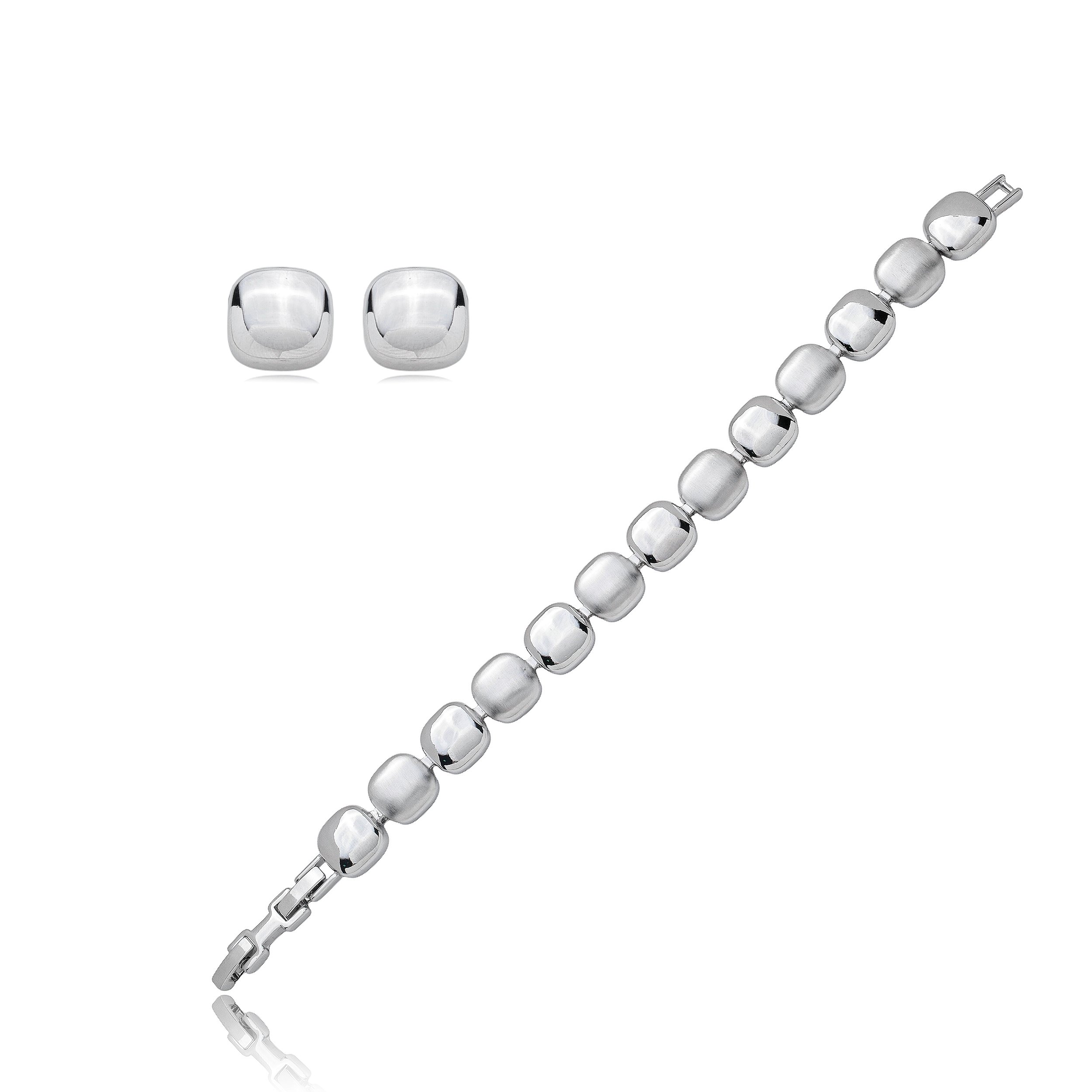Conjunto de brinco e pulseira acetinado liso banho em rodio branco
