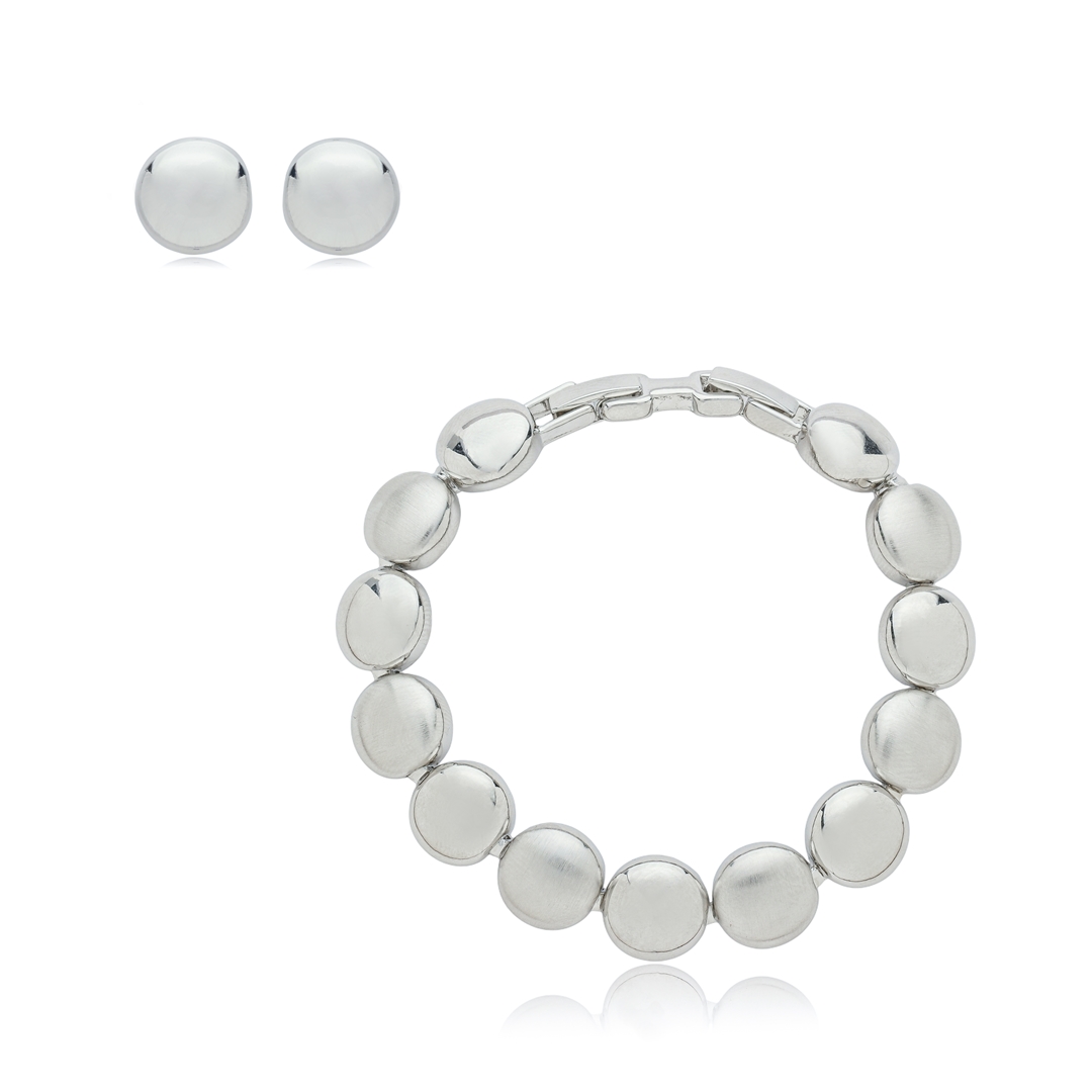 Conjunto de brinco e pulseira acetinado liso banho em rodio branco