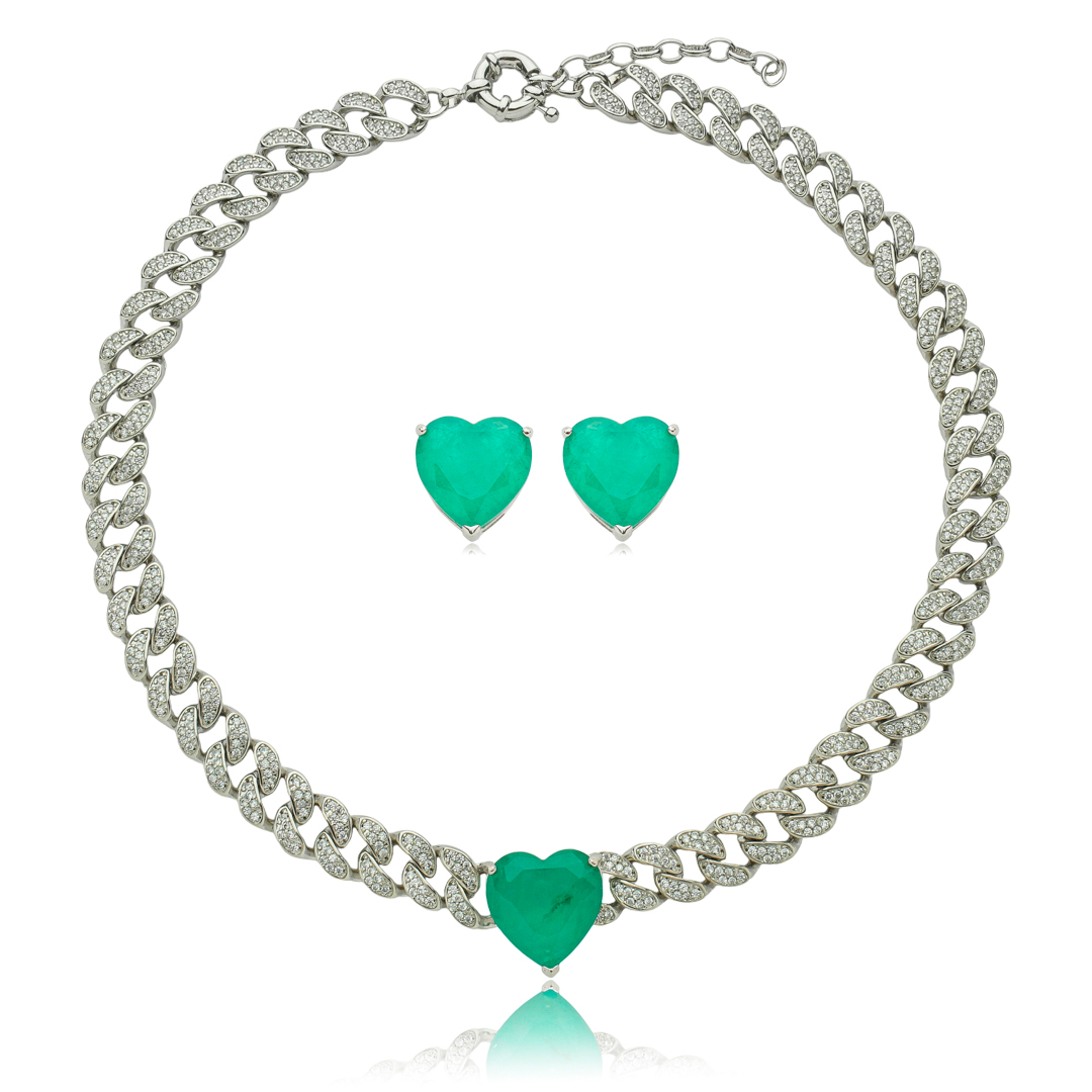 Conjunto de brinco e colar cravejado de zircônia cristal com pedra fusion esmeralda