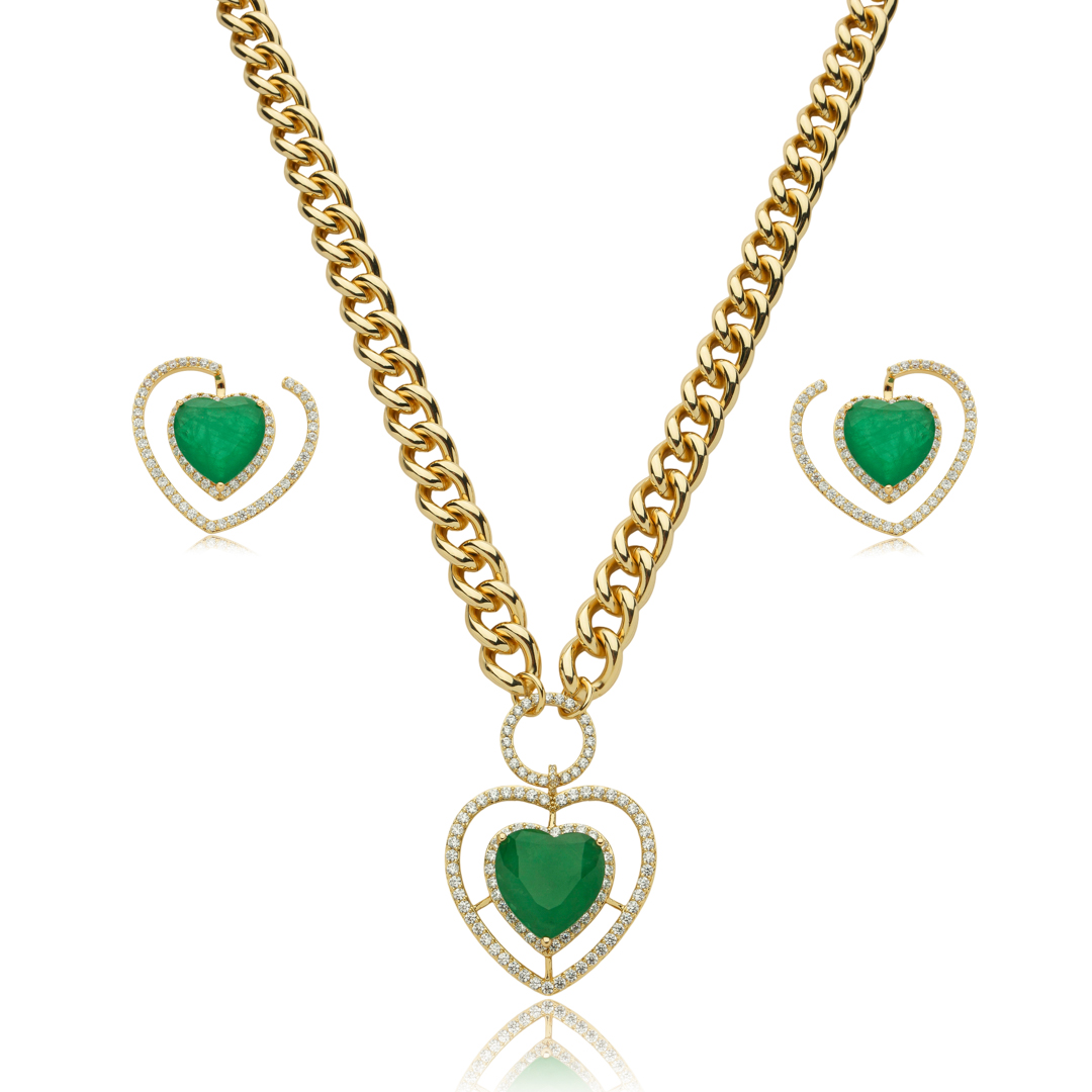 Conjunto de brinco e colar de coração cravejado de zircônia cristal e pedra fusion esmeralda
