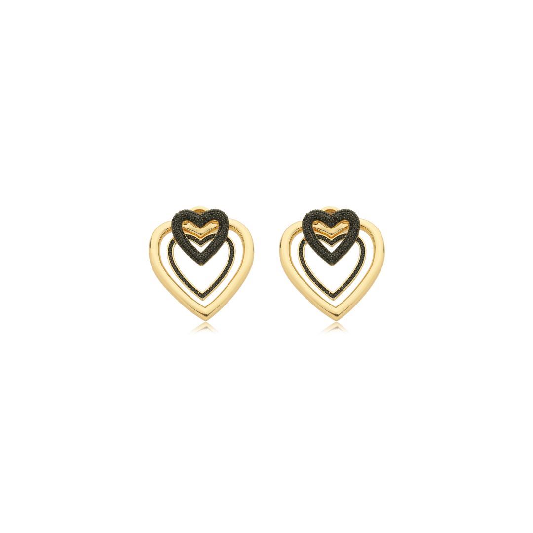 Brinco de coração cravejado de zirconia onix banho em ouro 18k