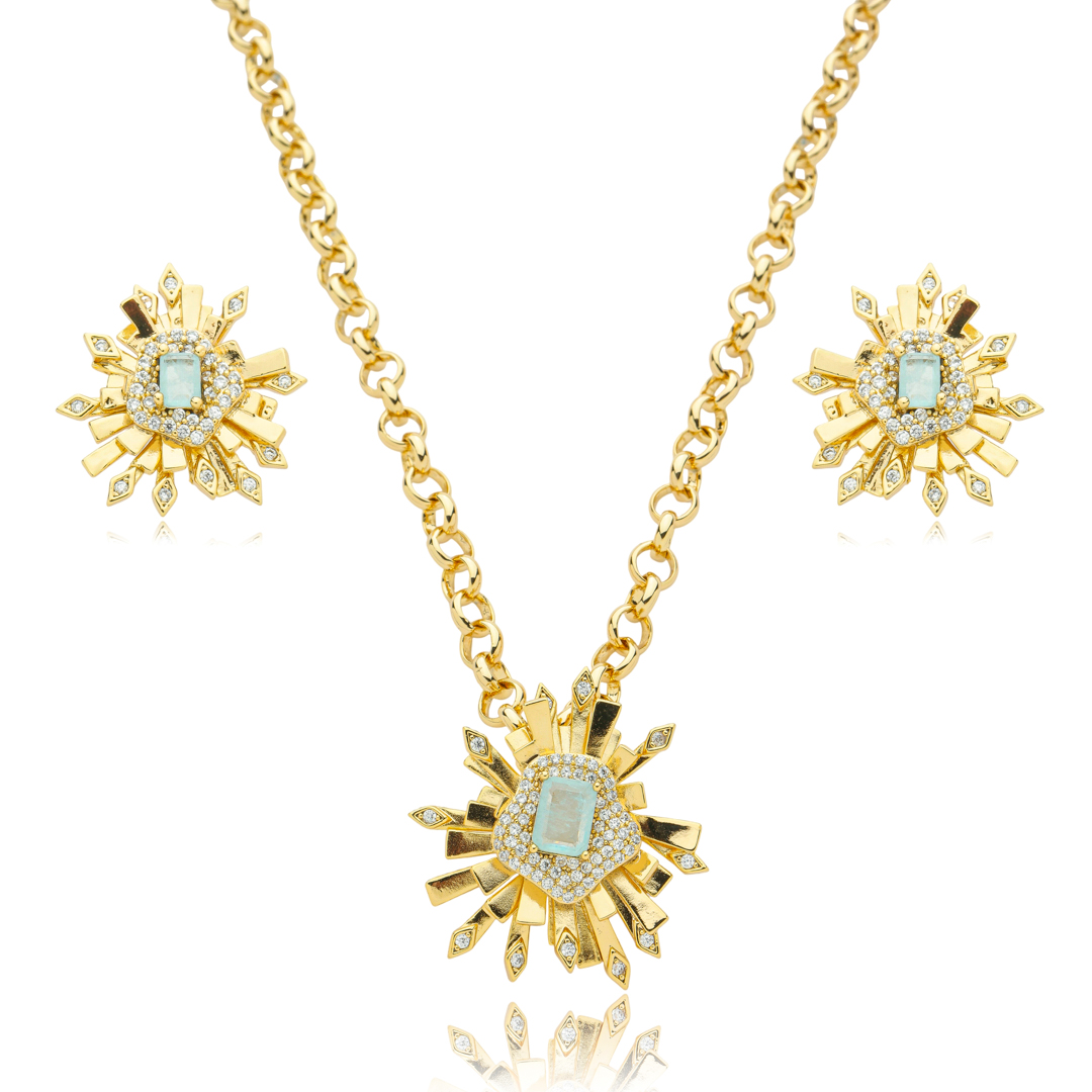 Conjunto de brinco e colar cravejado de zircônia cristal e pedra fusion acqua