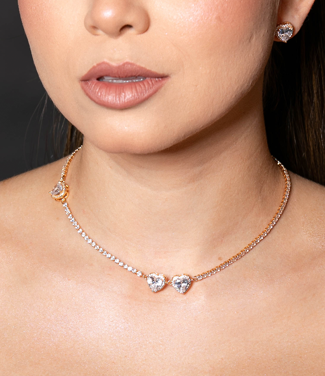 Conjunto de brinco e colar de coração cravejado de zircônia cristal