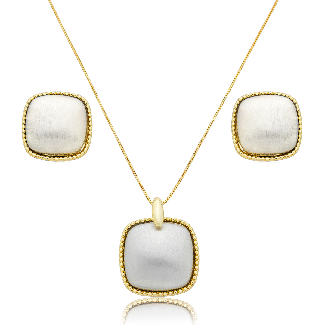 Este conjunto é uma verdadeira expressão de luxo e sofisticação, destacando-se não apenas pela sua beleza, mas também pela sua qualidade excepcional. Cada peça é submetida a um processo meticuloso de banho duplo, envolvendo ouro 18k e ródio branco, resultando em um brilho deslumbrante e uma elegância incomparável.