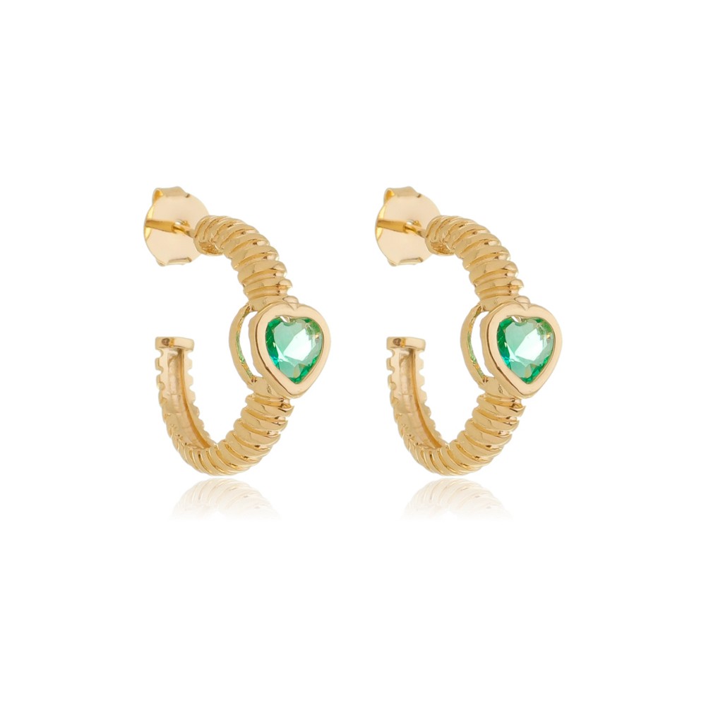 Brinco de argola dourado com detalhe em zirconia de coraçao verde agua