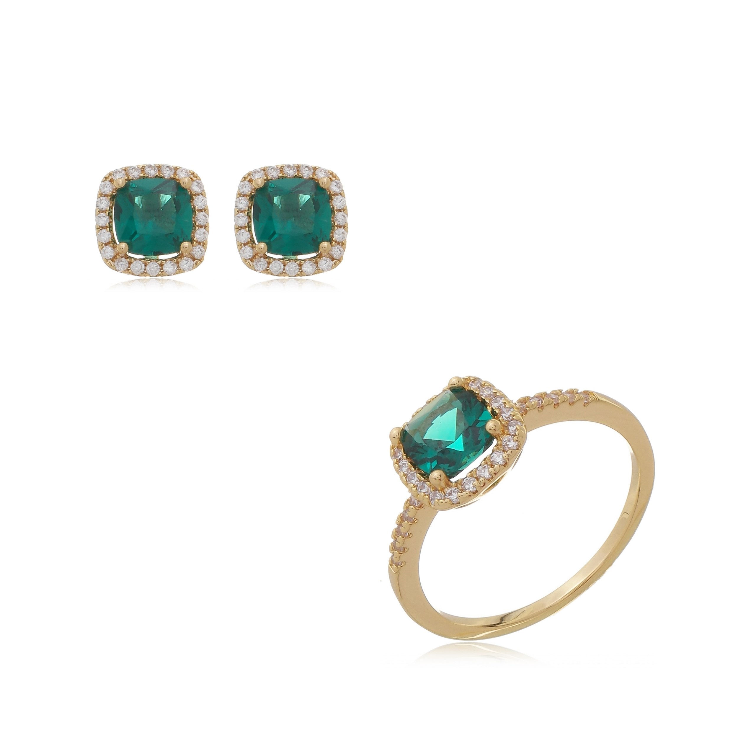 Conjunto de brinco e anel cravejado de zirconia esmeralda banho em ouro 18k