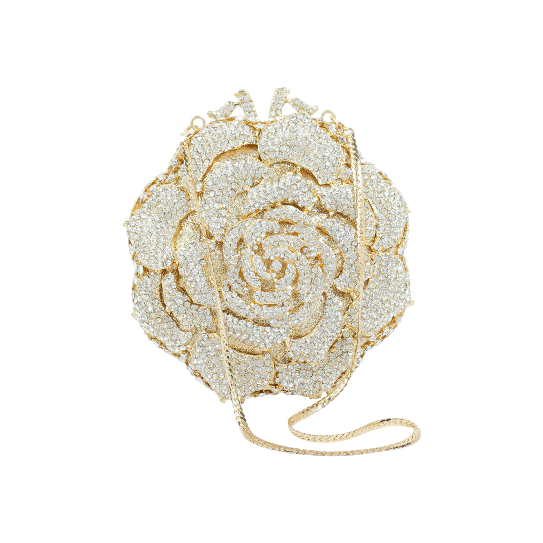 Bolsa de cluth flor em metal cravejada de cristais com alça removível
