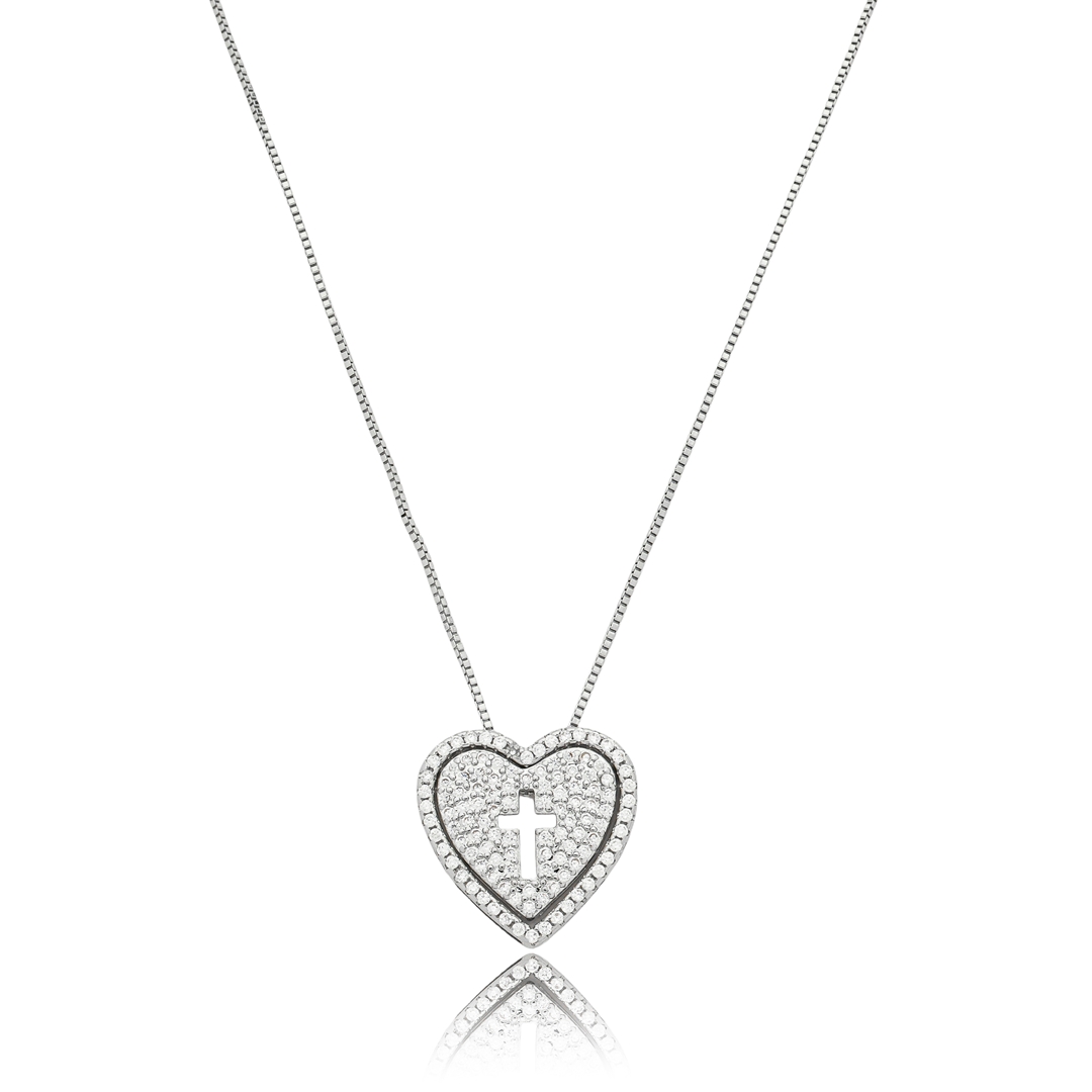 Colar com pingente de coração cravejado de zircônia cristal banho em ródio branco